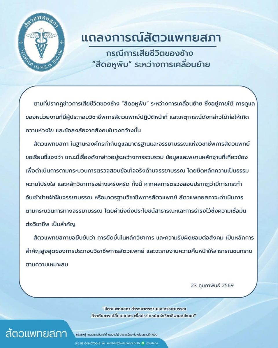 วันที่ 23 ก.พ.69 ตามที่ปรากฏข่าวการเสียชีวิตของช้าง “สีดอหูพับ” ระหว่างการเคลื่อนย้าย ซึ่งอยู่ภายใต้ การดูแลของหน่วยงานที่มีผู้ประกอบวิชาชีพการสัตวแพทย์ปฏิบัติหน้าที่ และเหตุการณ์ดังกล่าวได้ก่อให้เกิดความห่วงใย และข้อสงสัยจากสังคมในวงกว้างนั้น