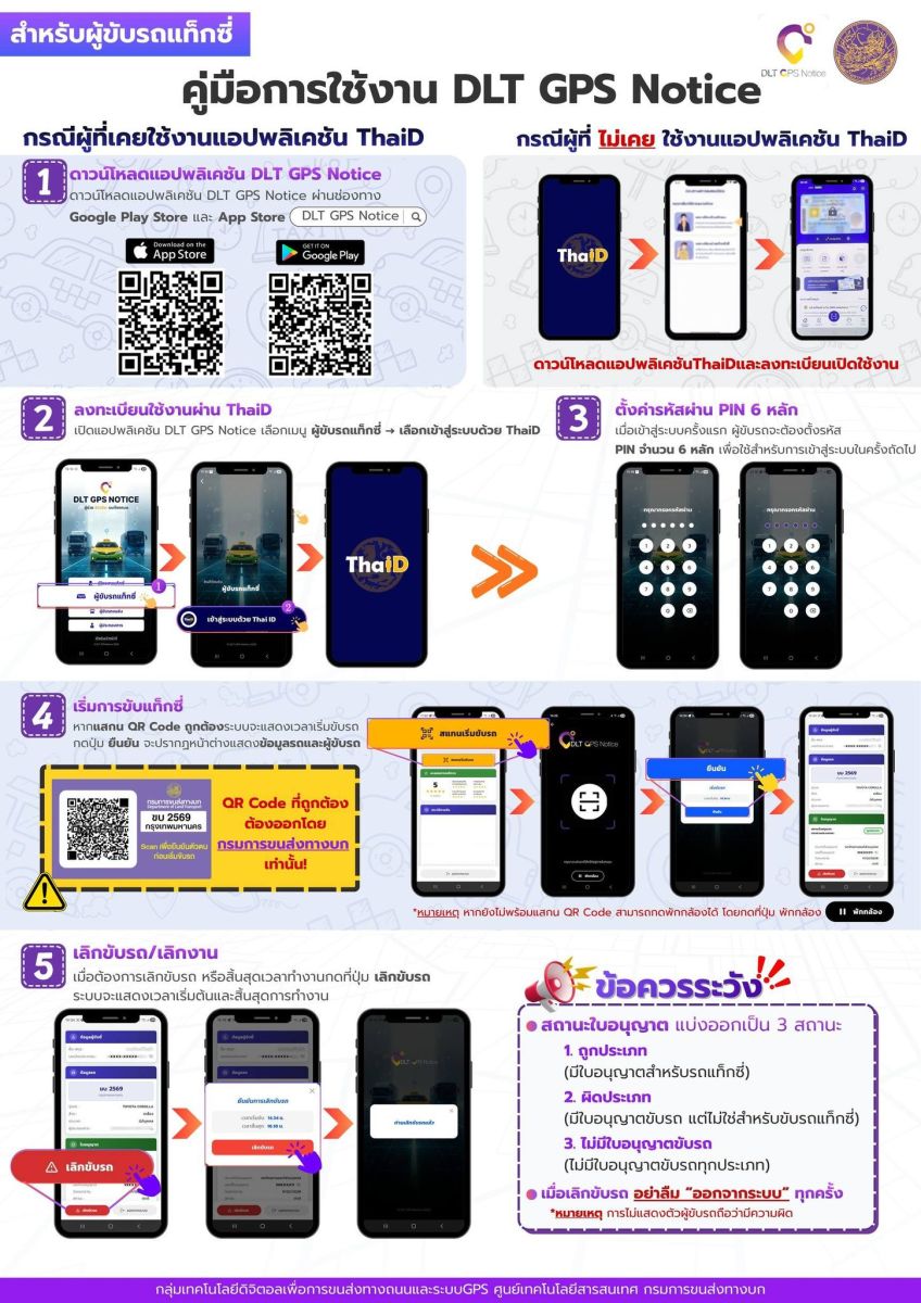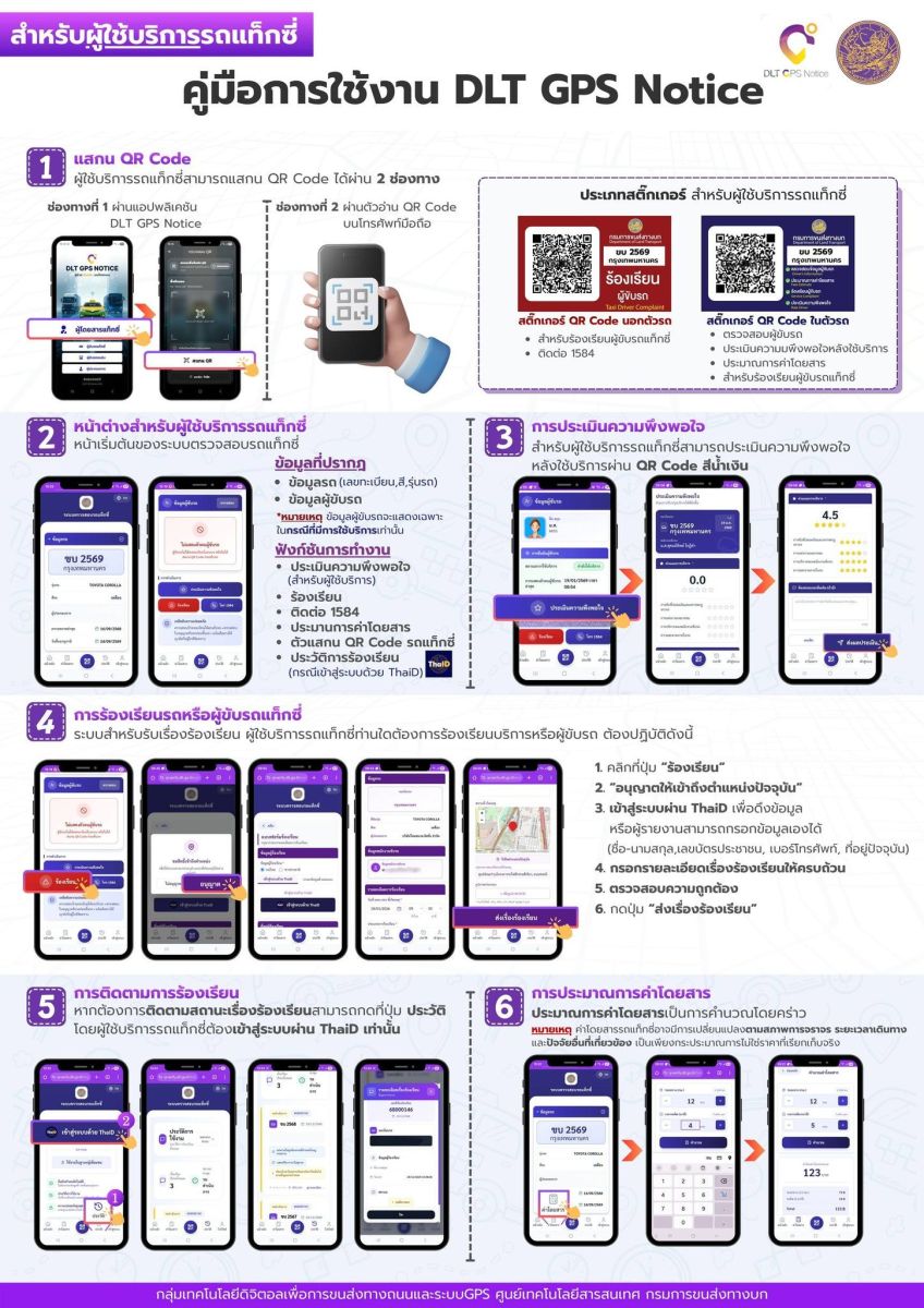 อธิบดีกรมการขนส่งทางบก กล่าวว่า สติ๊กเกอร์ QR Code จะแบ่งเป็น 3 สี คือ สีม่วง สำหรับผู้ขับรถแท็กซี่ ยืนยันตัวตนก่อนขับรถจะติดบริเวณ มุมขวาบนของกระจกฝั่งผู้ขับรถ สีน้ำเงิน สำหรับผู้โดยสารรถแท็กซี่ ใช้ตรวจสอบข้อมูลรถและผู้ขับขี่ คำนวณค่าโดยสารเบื้องต้น ประเมินความพึงพอใจและร้องเรียน ติดบริเวณ กระจกหน้าต่างรถฝั่งผู้โดยสารด้านหลัง และสีแดง สำหรับผู้โดยสารรถแท็กซี่ ใช้ร้องเรียนพฤติกรรมการขับขี่และการให้บริการ เช่นปฏิเสธผู้โดยสาร เก็บค่าโดยสารเกิน เป็นต้น ติดอยู่บริเวณกระจกหน้าต่างภายนอกรถแท็กซี่ โดยประชาชนผู้ใช้บริการรถแท็กซี่สามารถดาวน์โหลดแอปพลิเคชัน DLT GPS NOTICE เมื่อใช้บริการแท็กซี่ สามารถสแกน QR Code ที่ติดอยู่บริเวณกระจกหน้าต่างรถ (ทั้งภายนอกและภายใน) เพื่อตรวจสอบข้อมูลรถและผู้ขับขี่ ระบบจะแสดงภาพถ่ายคนขับ, ชื่อ-สกุล, ข้อมูลรถ, วันสิ้นอายุภาษี และสถานะใบอนุญาตขับรถ ทำให้ทราบทันทีว่าเป็นรถที่ถูกต้องตามกฎหมายหรือไม่ สามารถคำนวณค่าโดยสารเบื้องต้น ประเมินความพึงพอใจและร้องเรียนพฤติกรรมผู้ขับขี่ได้ทันทีแบบเรียลไทม์ หากพบปัญหา เช่น ขับรถประมาท หรือวาจาไม่สุภาพ ข้อมูลจะถูกส่งตรงเข้าสู่ระบบของกรมการขนส่งทางบก สำหรับผู้ขับขี่รถแท็กซี่ ต้องยืนยันตัวตนคนขับจริง (Driver Identity) โดยผู้ขับขี่ต้องลงทะเบียนผ่านแอปพลิเคชัน DLT GPS NOTICE และทำการสแกน QR Code ประจำรถ เพื่อเริ่มขับรถก่อนให้บริการ เพื่อยืนยันว่าตนเองเป็นผู้ขับขี่ในช่วงเวลานั้นจริง และระบบจะมีการแจ้งเตือนให้ยืนยันตัวตนทุกๆ 4 ชั่วโมง