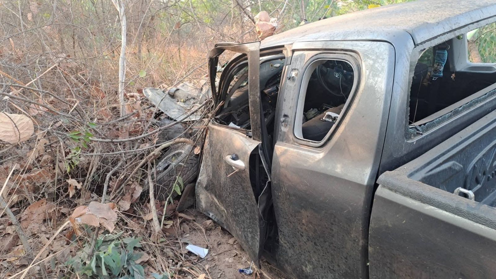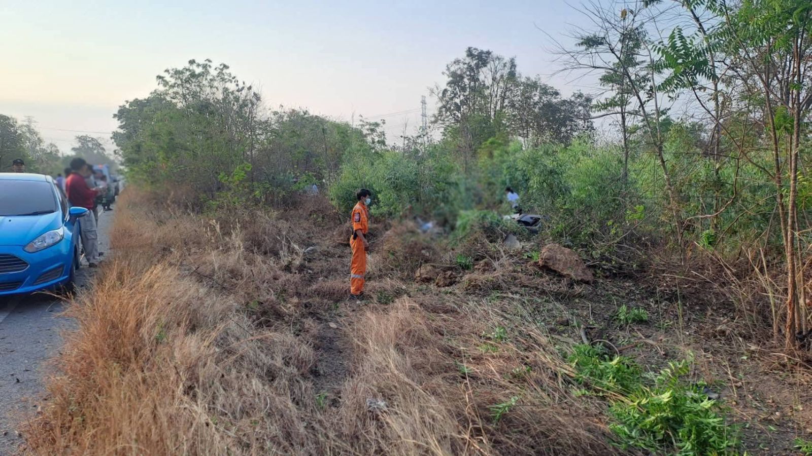 ที่เกิดเหตุ พบรถกระบะ โตโยต้า รีโว่ สีเทา ป้ายทะเบียน สกลนคร ลักษณะพุ่งเข้าไปในป่าหญ้าข้างทาง สภาพรถพังเสียหายทั้งคัน ตรวจสอบพบว่ามีผู้เสียชีวิต 2 ราย เป็น หญิงไทย อายุ 32 ปี และ ผู้หญิง อายุ 45 - 50 ปี ยังไม่พบเอกสารติดตัว
