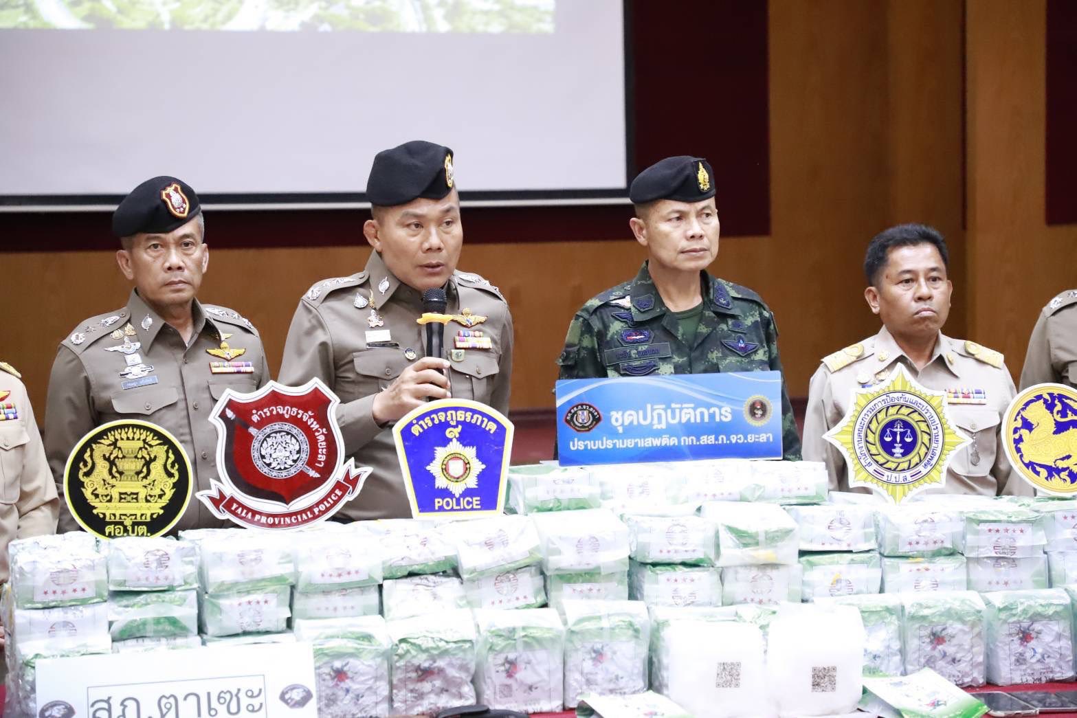 เมื่อวันที่ 24 ก.พ. 2569 ที่ กองบังคับการตำรวจภูธรจังหวัดยะลา อ.เมือง จ.ยะลา พลโท นรธิป โพยนอก แม่ทัพภาคที่ 4 พร้อมด้วย พล.ต.ท.ปิยะวัฒน์ เฉลิมศรี ผู้บัญชาการตำรวจภูธรภาค 9, นายนันทพงษ์ สุวรรณรัตน์ รองเลขาธิการ ศูนย์อำนวยการบริหารจังหวัดชายแดนภาคใต้, นายอำนาจ ชูทอง รองผู้ว่าราชการจังหวัดยะลา, นายวันอุสมาน ลาเต๊ะ ผอ.ส่วนตรวจสอบทรัพย์สิน สำนักงานป้องกันปราบปรามเสพติดภาค 9 และชุดจับกุม ร่วมแถลงผลการปฏิบัติการกวาดล้างเครือข่ายยาเสพติดรายใหญ่ จับกุมผู้ต้องหา 3 ราย พร้อมของกลางไอซ์ 400 กิโลกรัม และอาวุธปืน มูลค่าความเสียหายทางเศรษฐกิจกว่า 72 ล้านบาท