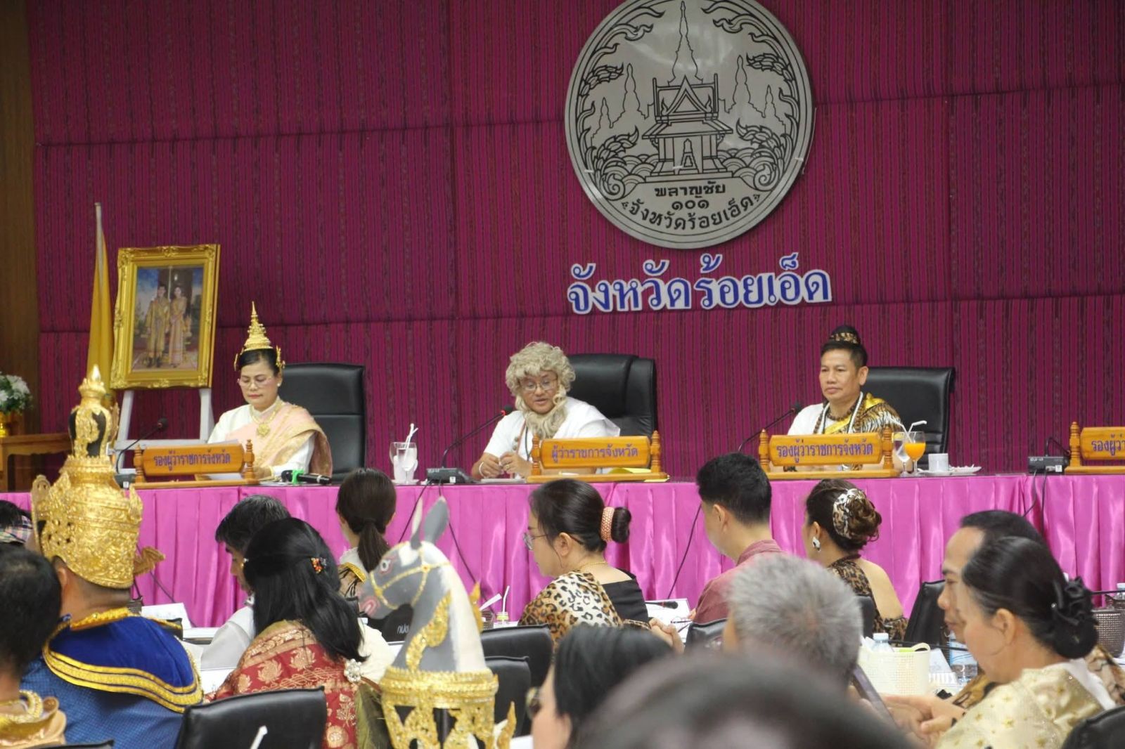 วันที่ 26 กุมภาพันธ์ 2569 เวลา 09.30 น. ณ ห้องประชุมพระมหาเจดีย์ชัยมงคล ศาลากลางจังหวัดร้อยเอ็ด นายชัชวาลย์ เบญจสิริวงศ์ ผู้ว่าราชการจังหวัดร้อยเอ็ด สร้างสีสันมิติใหม่ให้กับการประชุมคณะกรมการจังหวัด ครั้งที่ 2/2569 ด้วยการแต่งกายชุด "ชูชก" นำทีมรองผู้ว่าราชการจังหวัดและหัวหน้าส่วนราชการ นายอำเภอ พร้อมใจกันแต่งกายเป็นตัวละครสำคัญในมหาเวสสันดรชาดก อาทิ พระเวสสันดร กัณหา-ชาลี รวมถึงน้องกมลรัตน์ ศรีอาภรณ์ นางสาวไทยร้อยเอ็ด ประจำปี 2569 ที่ร่วมแต่งกายในชุด "พระนางมัทรี" อย่างงดงาม เพื่อเป็นการประชาสัมพันธ์ Soft Power และสร้างบรรยากาศก่อนเข้าสู่งาน “มหาทานบารมี ประเพณีบุญผะเหวดร้อยเอ็ด” ประจำปี 2569 ที่ที่กำลังจะจัดขึ้นในวันที่ 6 – 8 มีนาคม 2569 ณ สวนสมเด็จพระศรีนครินทร์ และบริเวณบึงพลาญชัยร้อยเอ็ด
