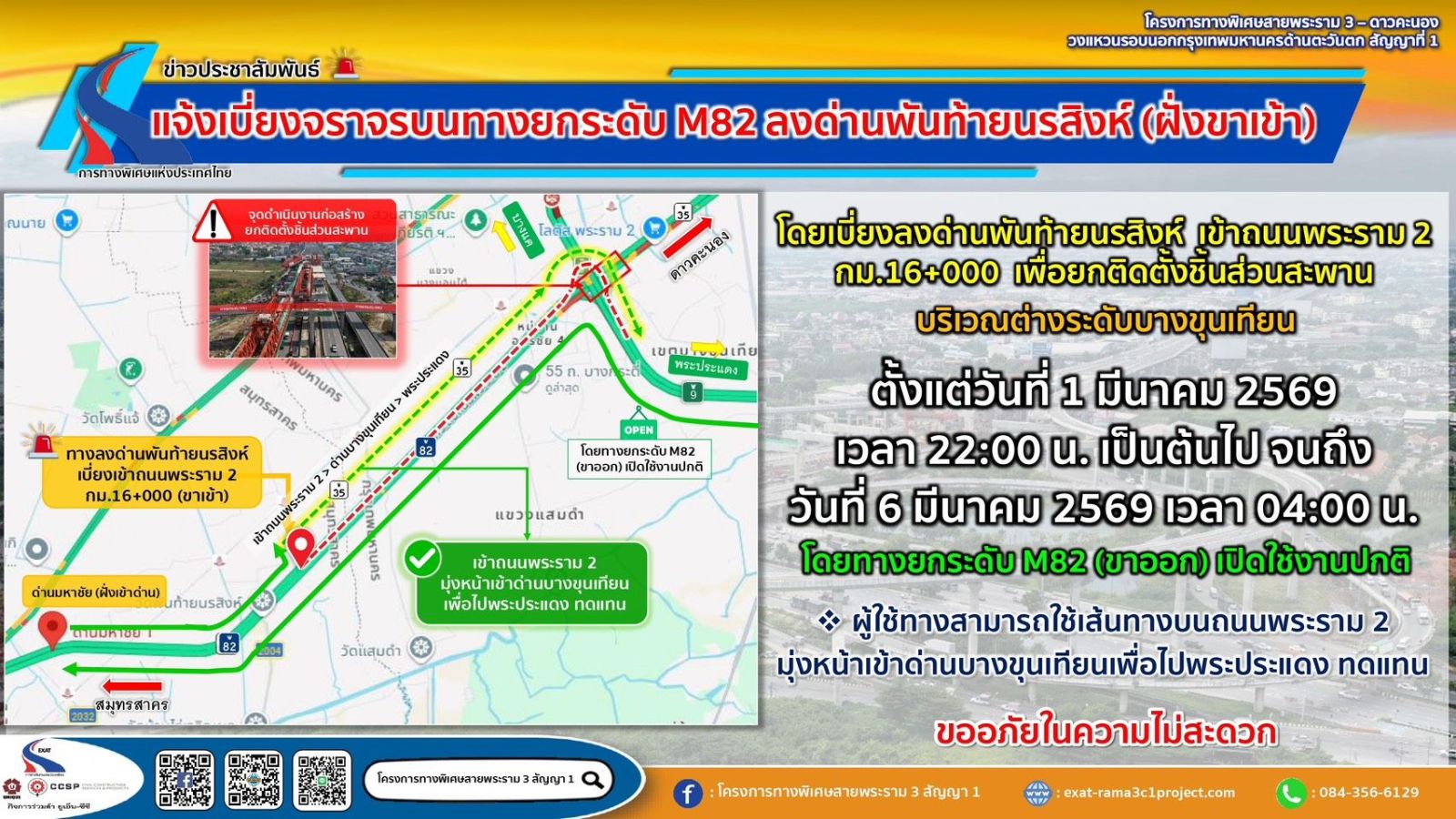 กทพ.จึงขอแจ้งเบี่ยงจราจรบนทางยกระดับ M82 (ฝั่งขาเข้าเมือง) ลงด่านพันท้ายนรสิงห์ เข้าสู่ถนนพระราม 2 บริเวณกิโลเมตรที่ 16+000 เพื่อดำเนินการยกติดตั้งชิ้นส่วนสะพานของโครงการก่อสร้างทางพิเศษ บริเวณต่างระดับบางขุนเทียน โดยจะดำเนินการตั้งแต่วันที่ 1 มีนาคม 2569 เวลา 22.00 น. เป็นต้นไป จนถึงวันที่ 6 มีนาคม 2569 เวลา 04.00 น.