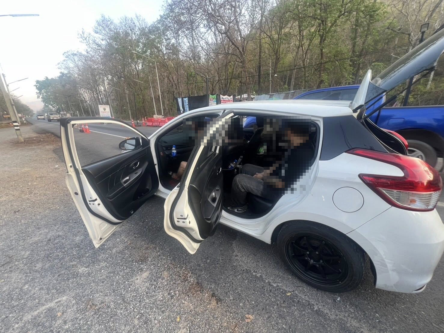 พบรถยนต์นั่งส่วนบุคคล สีขาว ต้องสงสัย มีนายกอ (นามสมมุติ) อายุ 28 ปี สัญชาติไทย (ผู้ขับขี่) ชาว อ.ศีขรภูมิ จ.สุรินทร์ และตรวจสอบภายในห้องโดยสารพบบุคคลต่างด้าว จำนวน 3 ราย ไม่มีเอกสารแสดงตนต่อ จนท.ให้การว่าเป็นบุคคลสัญชาติจีน