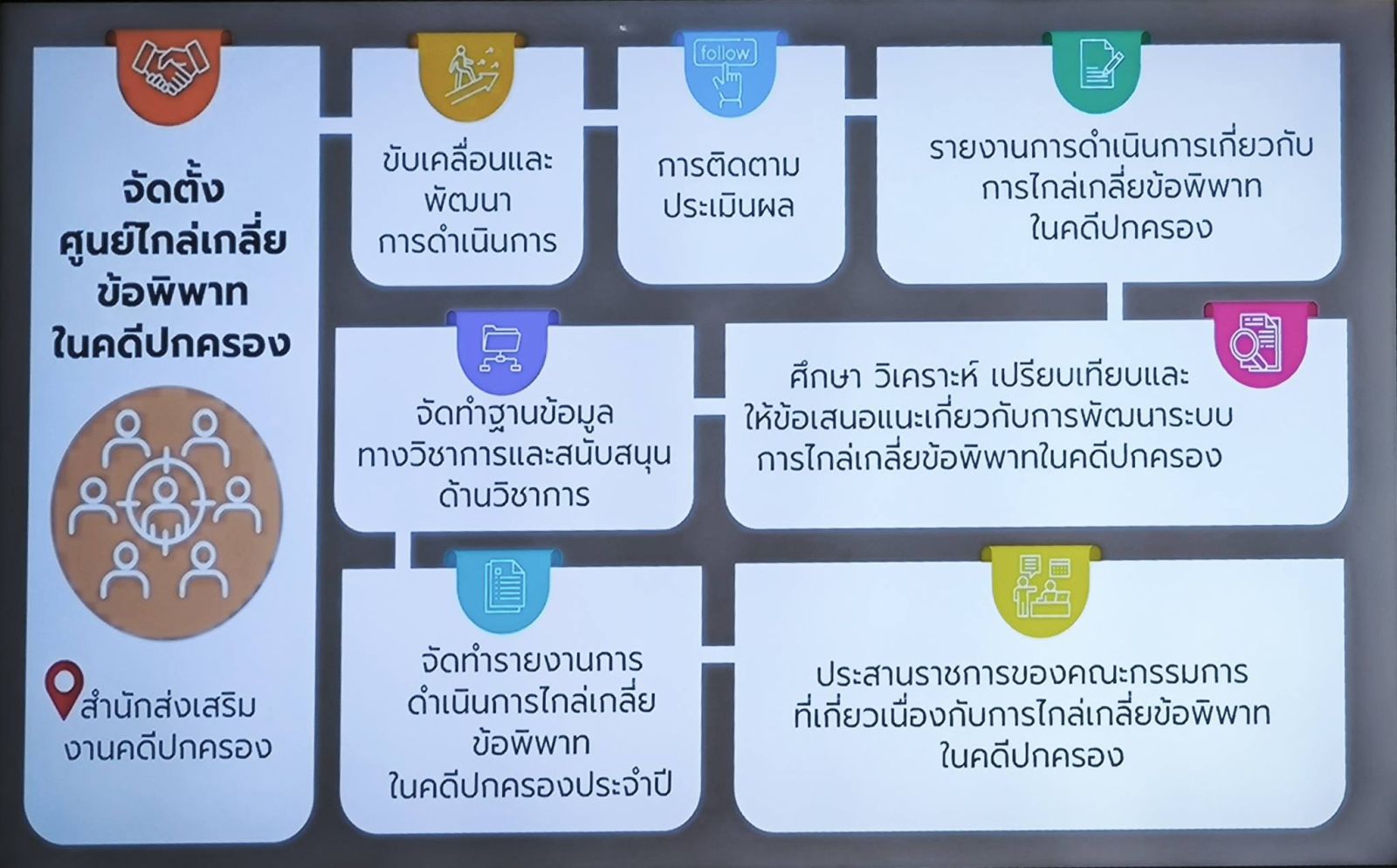 ในขณะเดียวกัน ได้มีการจัดตั้งศูนย์ไกล่เกลี่ยข้อพิพาทในคดีปกครองในสำนักส่งเสริมงานคดีปกครอง เพื่อทำหน้าที่สำคัญในการขับเคลื่อนและพัฒนาการดำเนินการ การติดตามประเมินผล และรายงานการดำเนินการเกี่ยวกับการไกล่เกลี่ยข้อพิพาทในคดีปกครอง ตลอดจนศึกษา วิเคราะห์ เปรียบเทียบและให้ข้อเสนอแนะเกี่ยวกับการพัฒนาระบบการไกล่เกลี่ยข้อพิพาทในคดีปกครอง จัดทำฐานข้อมูลทางวิชาการและสนับสนุนด้านวิชาการ รวมถึงจัดทำรายงานการดำเนินการไกล่เกลี่ยข้อพิพาทในคดีปกครองประจำปี และประสานราชการของคณะกรรมการที่เกี่ยวเนื่องกับการไกล่เกลี่ยข้อพิพาทในคดีปกครอง