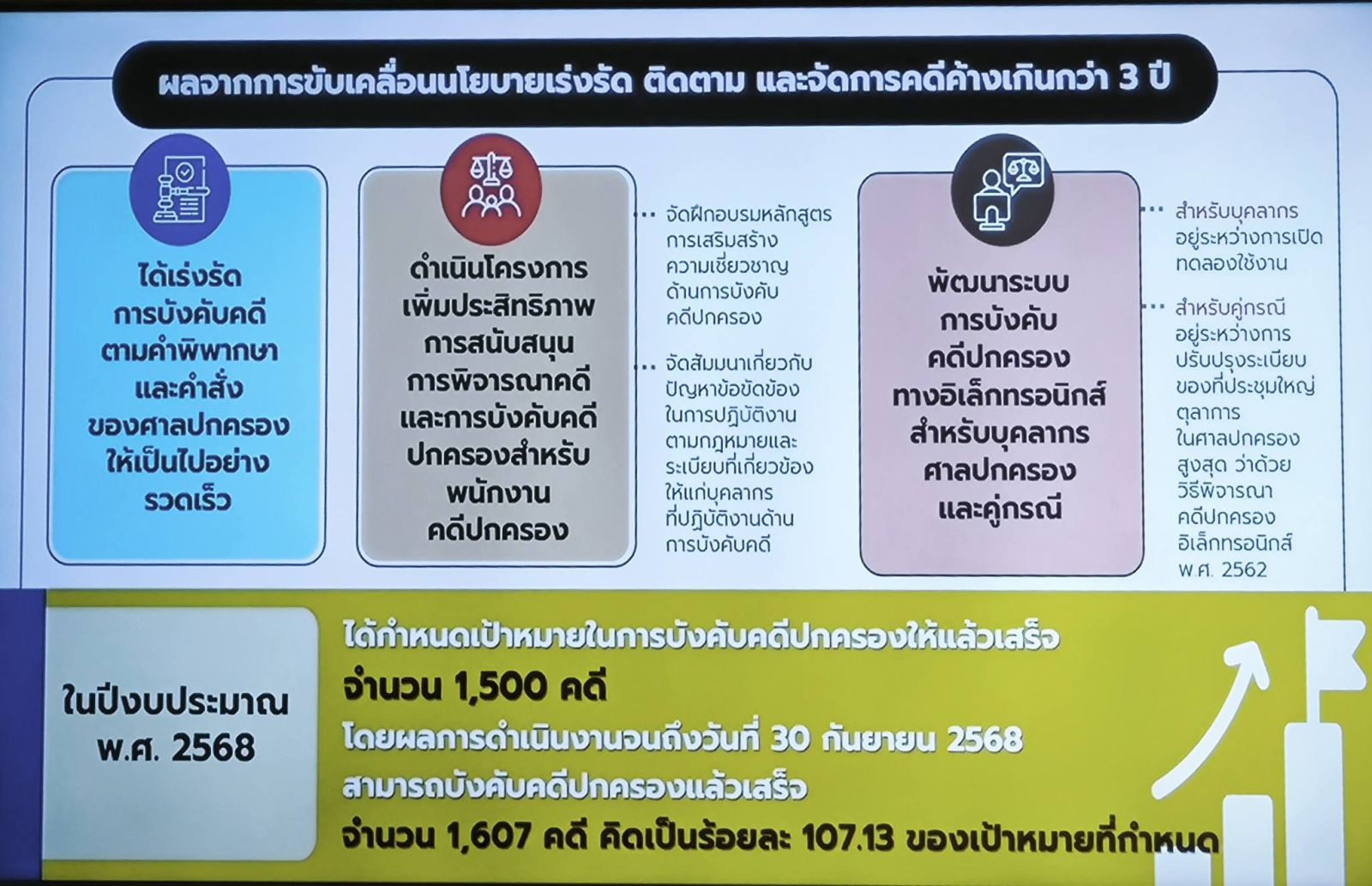นอกจากนี้ ได้เร่งรัดการบังคับคดีตามคำพิพากษาและคำสั่งของศาลปกครองให้เป็นไปอย่างรวดเร็ว รวมทั้งได้ดำเนินโครงการเพิ่มประสิทธิภาพการสนับสนุนการพิจารณาคดีและการบังคับคดีปกครองสำหรับพนักงานคดีปกครอง โดยจัดการฝึกอบรมหลักสูตรการเสริมสร้างความเชี่ยวชาญด้านการบังคับคดีปกครอง และจัดสัมมนาเกี่ยวกับปัญหาข้อขัดข้องในการปฏิบัติงานตามกฎหมายและระเบียบที่เกี่ยวข้องให้แก่บุคลากรที่ปฏิบัติงานด้านการบังคับคดี รวมทั้งพัฒนาระบบการบังคับคดีปกครองทางอิเล็กทรอนิกส์สำหรับบุคลากรศาลปกครองและคู่กรณี ซึ่งขณะนี้ระบบบังคับคดีปกครองอิเล็กทรอนิกส์สำหรับบุคลากรศาลปกครอง อยู่ระหว่างการเปิดทดลองใช้งาน ส่วนระบบบังคับคดีปกครองทางอิเล็กทรอนิกส์สำหรับบริการคู่กรณี อยู่ระหว่างการปรับปรุงระเบียบของที่ประชุมใหญ่ตุลาการในศาลปกครองสูงสุด ว่าด้วยวิธีพิจารณาคดีปกครองอิเล็กทรอนิกส์ พ.ศ. 2562 ซึ่งในปีงบประมาณ พ.ศ. 2568 ได้กำหนดเป้าหมายในการบังคับคดีปกครองให้แล้วเสร็จ จำนวน 1,500 คดี โดยมีผลการดำเนินงานจนถึงวันที่ 30 กันยายน 2568 สามารถดำเนินการบังคับคดีปกครองแล้วเสร็จ จำนวน 1,607 คดี คิดเป็นร้อยละ 107.13 ของเป้าหมายที่กำหนด