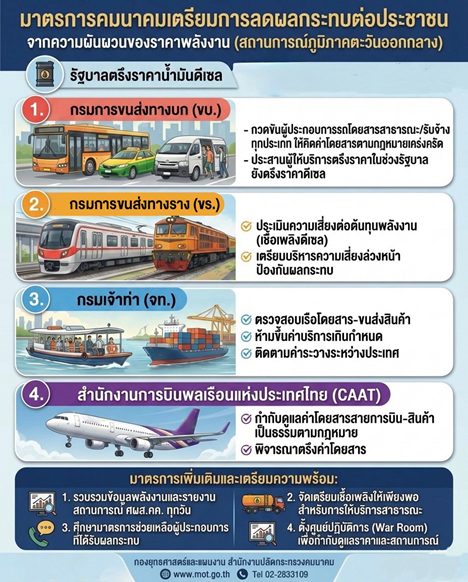 นายพิพัฒน์ รัชกิจประการ รองนายกรัฐมนตรีและรัฐมนตรีว่าการกระทรวงคมนาคม เปิดเผยว่า ตามข้อสั่งการของนายกรัฐมนตรี นายอนุทิน ชาญวีรกูล ที่ให้ทุกหน่วยงานเตรียมมาตรการรองรับสถานการณ์ความตึงเครียดในภูมิภาคตะวันออกกลาง ซึ่งอาจส่งผลกระทบต่อราคาพลังงานโลก กระทรวงคมนาคม โดยนายชยธรรม์ พรหมศร ปลัดกระทรวงคมนาคม ได้หารือร่วมกับหน่วยงานในสังกัดที่เกี่ยวข้อง เพื่อเร่งกำหนดมาตรการดูแลประชาชน โดยเฉพาะการควบคุมอัตราค่าโดยสารของระบบขนส่งสาธารณะไม่ให้มีการปรับขึ้นเกินกว่าที่กฎหมายกำหนด
