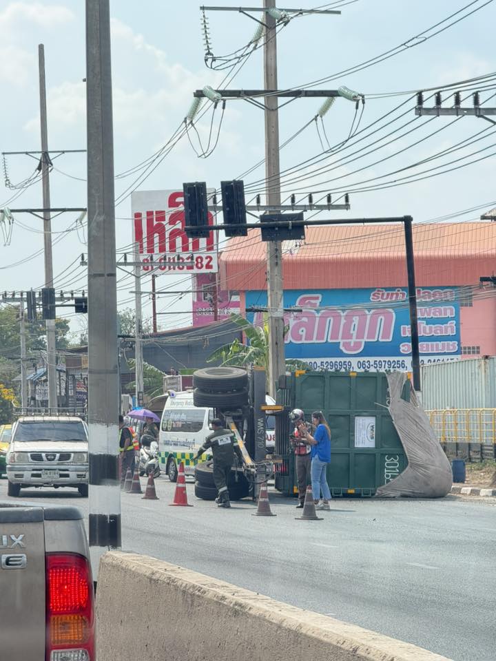 7 มี.ค. 69 เวลา 14.30 น. ถ.รังสิตนครนายก ขาออก แยกคลอง 7 รถบรรทุกพ่วงพลิกตะแคง อยู่ระหว่างเคลื่อนย้าย ท้ายสะสมไปถึงคลอง 5