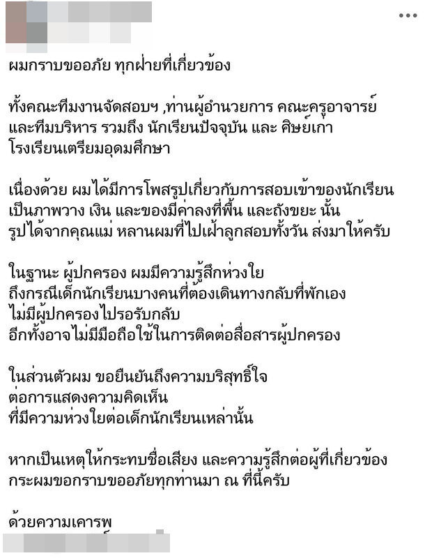 สำหรับโพสต์ต้นเรื่องได้โพสต์ขออภัยเรื่องราวที่เกิดขึ้น โดยระบุว่า ผมกราบขออภัย ทุกฝ่ายที่เกี่ยวข้อง ทั้งคณะทีมงานจัดสอบฯ, ท่านผู้อำนวยการ คณะครูอาจารย์ และทีมบริหาร รวมถึงนักเรียนปัจจุบัน และศิษย์เก่าโรงเรียนเตรียมอุดมศึกษา