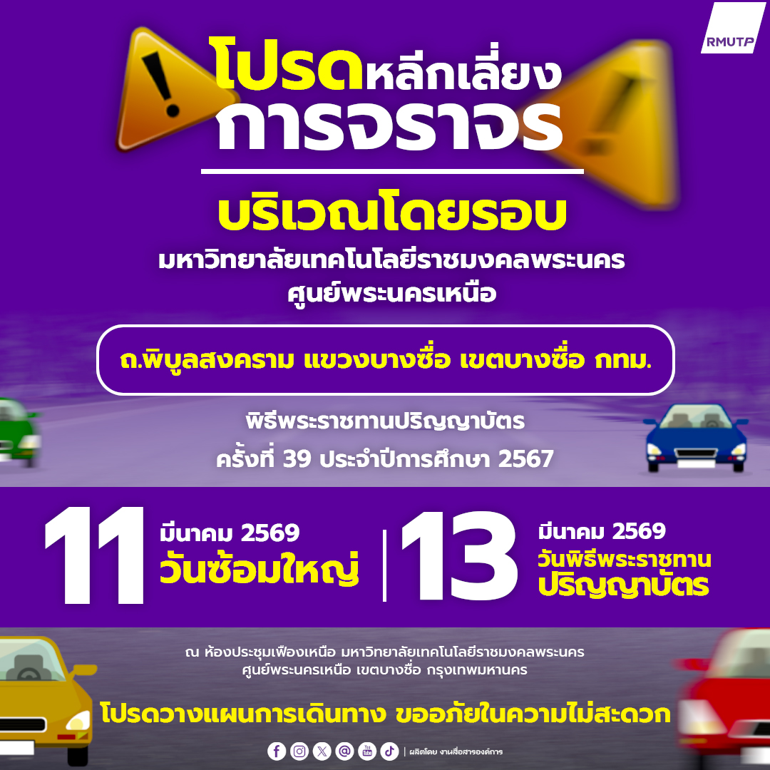 มหาวิทยาลัยเทคโนโลยีราชมงคลพระนคร (ศูนย์พระนครเหนือ) ถนนพิบูลสงคราม มีซ้อมพิธีพระราชทานปริญญาบัตร วันพุธที่ 11 มีนาคม 2569 และวันพระราชทานปริญญาบัตร : วันศุกร์ที่ 13 มีนาคม 2569