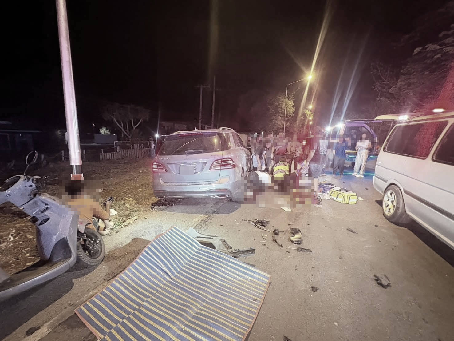 ที่เกิดเหตุ พบรถนั่งส่วนบุคคล เบนซ์ สีเทา ป้ายทะเบียน กทม. สภาพหน้ารถพังเสียหาย ใกล้กัน พบรถกระบะ มิตซูบิชิ ไทรทัน สีดำ ป้ายทะเบียน สระบุรี สภาพด้านท้ายรถพังเสียหาย