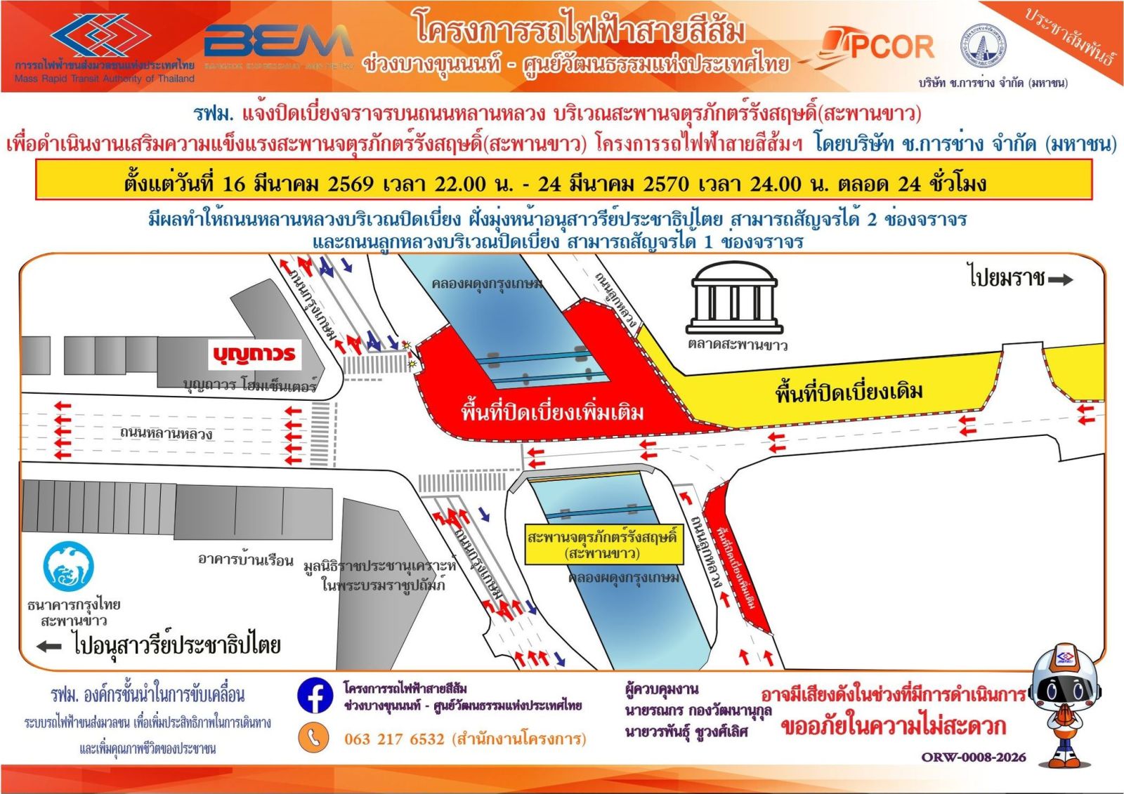การรถไฟฟ้าขนส่งมวลชนแห่งประเทศไทย (รฟม.) แจ้งว่า บริษัท ช.การช่าง จำกัด (มหาชน) ผู้รับจ้างออกแบบและก่อสร้างอุโมงค์ทางวิ่งและสถานีใต้ดิน โครงการรถไฟฟ้าสายสีส้ม ช่วงบางขุนนนท์ – ศูนย์วัฒนธรรมแห่งประเทศไทย จะดำเนินงานเสริมความแข็งแรงสะพานจตุรภักตร์รังสฤษดิ์ (สะพานขาว) จึงมีความจำเป็นต้องปิดเบี่ยงจราจร 4 ช่องจราจร ชิดทางเท้า บนสะพานจตุรภักตร์รังสฤษดิ์ (สะพานขาว) ถนนหลานหลวง และปิดเบี่ยงจราจร 1 ช่องจร าจร บนถนนลูกหลวง ตั้งแต่วันที่ 16 มีนาคม 2569 เวลา 22.00 น. – 24 มีนาคม 2570 เวลา 24.00 น. (ตลอด 24 ชั่วโมง) มีผลให้ถนนหลานหลวงบริเวณปิดเบี่ยง ฝั่งมุ่งหน้าอนุสาวรีย์ประชาธิปไตย สามารถสัญจรได้ 2 ช่องจราจร และถนนลูกหลวงบริเวณปิดเบี่ยง สามารถสัญจรได้ 1 ช่องจราจร โดยประชาชนสามารถเข้า – ออกที่พักอาศัยได้ตามปกติ