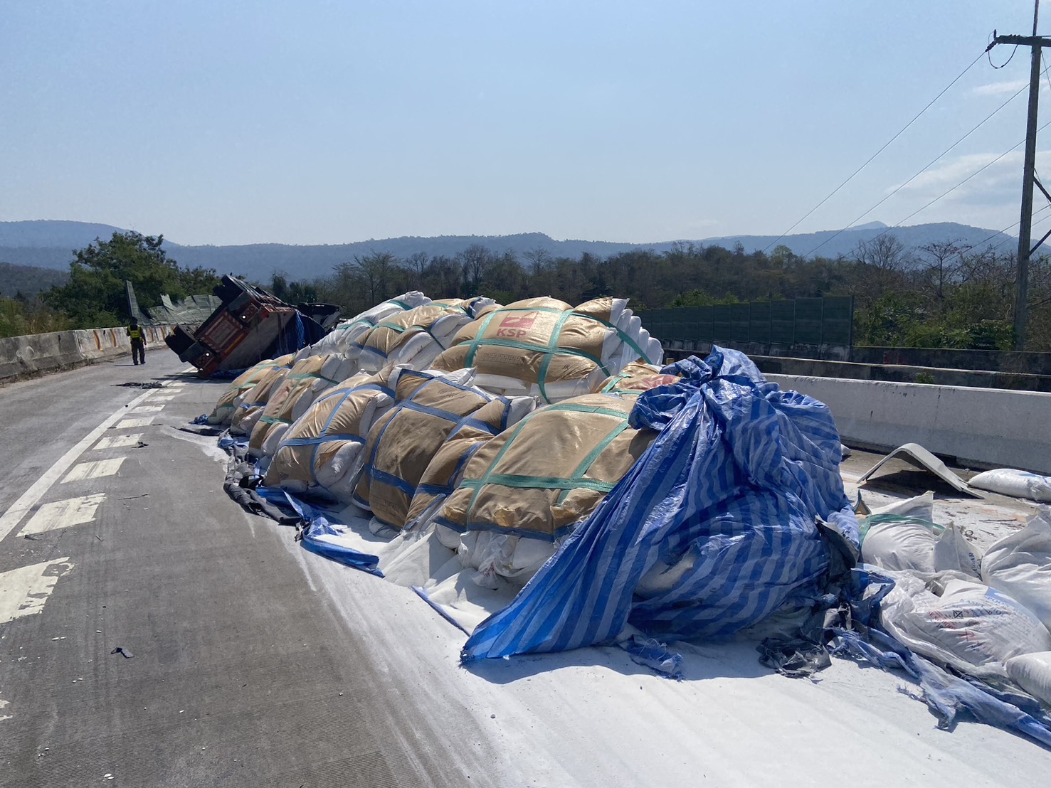 เวลา 10.01 น. วันที่ 14 มีนาคม 2569 ตำรวจทางหลวง เข้าตรวจสอบเหตุรถบรรทุกกึ่งพ่วงบรรทุกน้ำตาลเกิดอุบัติเหตุเสียหลัก พลิกตะแคง ด้วยตัวเอง บริเวณทางหลวงหมายเลข 304 กม.208+900 ขาเข้า กทม. ส่งผลให้กีดขวางการจราจร