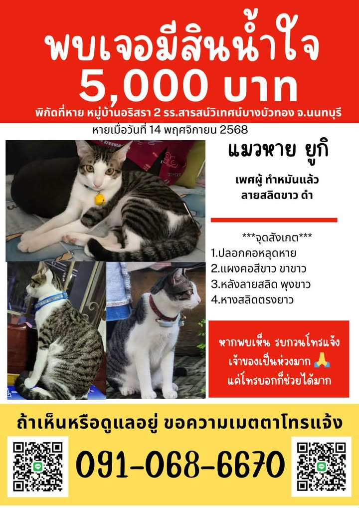 คุณแนน ฝากตามหาแมวไทยชื่อ น้องยูกิ เพศผู้ ทำหมันแล้ว ลายสลิด ขาว ดำ จุดสังเกตแผงคอสีขาว ขาสีขาว พุงขาว หลังลายสลิด หางตรงยาว วันที่หายไม่ได้สวมปลอกคอ หายไปจากหมู่บ้านอริสรา 2 โรงเรียนสารศาสตร์วิเทศบางบัวทอง เมื่อวันที่ 14 พ.ย. 68 พบเจอน้อง พาน้องส่งคืน เจ้าของพร้อมมอบสินน้ำใจให้ จำนวน 5,000 บาท