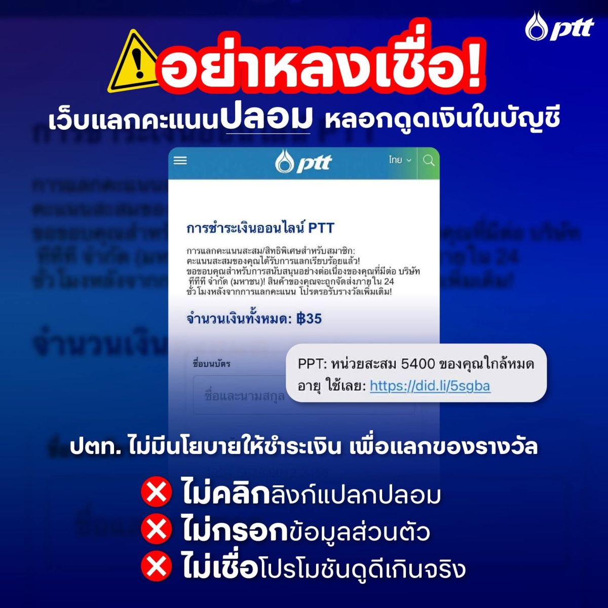 ระวังเว็บปลอมแอบอ้าง ปตท. หลอกแลกคะแนนสะสม!