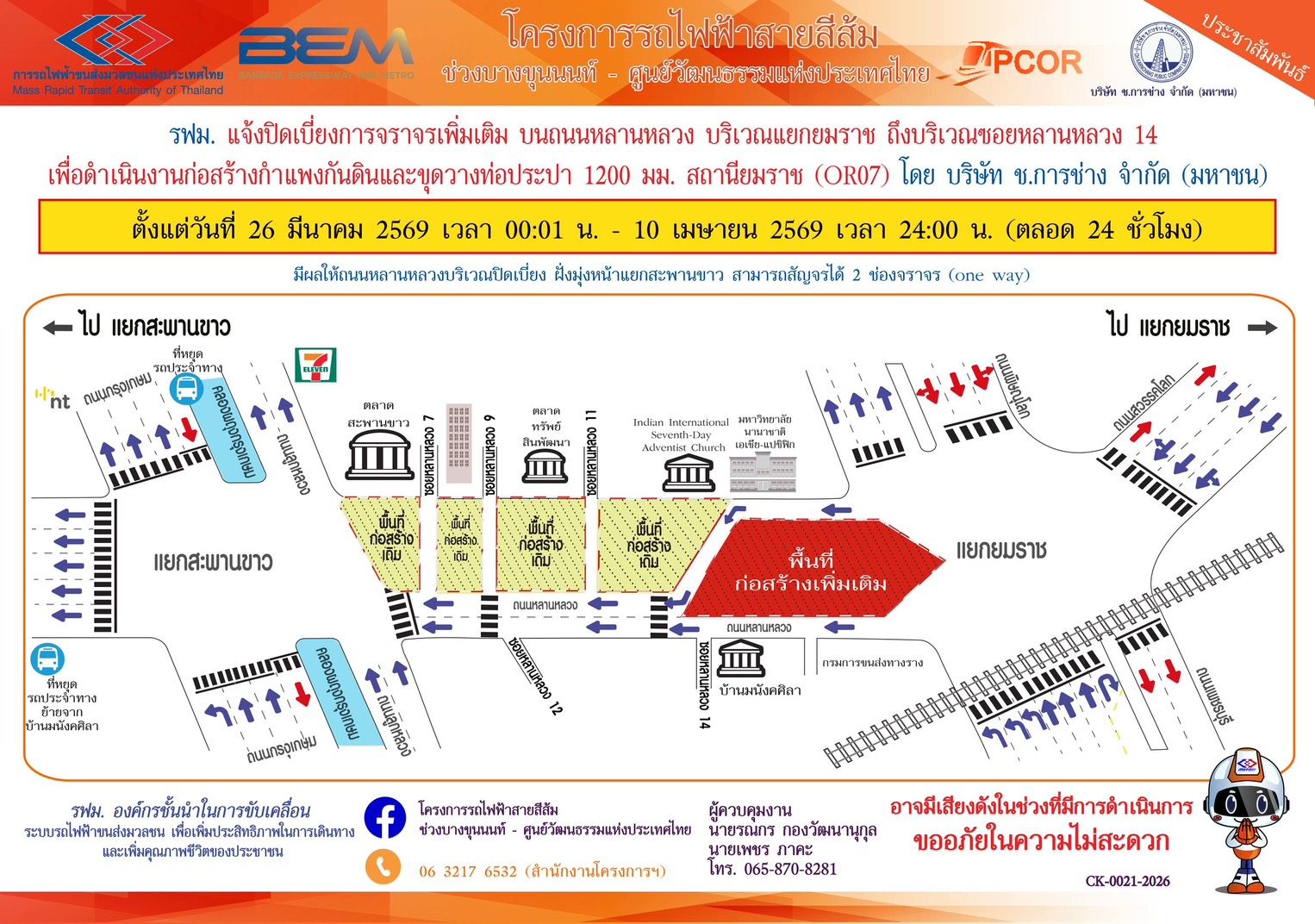 #แจ้งเลื่อนวันปิดเบี่ยงการจราจรเพิ่มเติมบนถนนหลานหลวง บริเวณแยกยมราช ถึงบริเวณซอยหลานหลวง 14 เพื่อดำเนินงานก่อสร้างกำแพงกันดินและขุดวางท่อประปา 1,200 มม. สถานียมราช (OR07) โครงการรถไฟฟ้าสายสีส้ม ช่วงบางขุนนนท์ - ศูนย์วัฒนธรรมแห่งประเทศไทย ตั้งแต่วันที่ 26 มีนาคม 2569 เวลา 00:01 น. (จากเดิม 16 มีนาคม 2569) – 10 เมษายน 2569 เวลา 24:00 น. (ตลอด 24 ชั่วโมง) มีผลให้ถนนหลานหลวงบริเวณปิดเบี่ยง ฝั่งมุ่งหน้าแยกสะพานขาว สามารถสัญจรได้ 2 ช่องจราจร (one way) โดยประชาชนสามารถเข้า – ออกที่พักอาศัยได้ตามปกติ