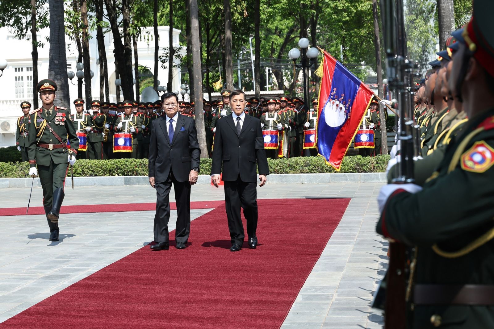 เมื่อเสด็จพระราชดำเนินถึง นายทองลุน ลีสุลิด ประธานประเทศแห่งสาธารณรัฐประชาธิปไตยประชาชนลาว และนางนาลี สีสุลิด ภริยา เฝ้าทูลละอองธุลีพระบาทรับเสด็จ จากนั้น เด็กหญิงชาวลาว และเด็กชายชาวลาว เฝ้าทูลละอองธุลีพระบาท ทูลเกล้าทูลกระหม่อมถวายช่อดอกไม้ แล้วเสด็จพระราชดำเนินพร้อมด้วยประธานประเทศขึ้นแท่นรับการถวายความเคารพ กองทหารเกียรติยศถวายความเคารพ และทรงตรวจแถวกองทหารเกียรติยศ เมื่อตรวจแถวทหารกองเกียรติยศ เสร็จแล้ว พระบาทสมเด็จพระเจ้าอยู่หัว และสมเด็จพระนางเจ้า ฯ พระบรมราชินี เสด็จพระราชดำเนินพร้อมด้วยประธานประเทศ และภริยา ไปยังแถวคณะทางการฝ่ายลาว ทรงรับการทูลแนะนำคณะทางการฝ่ายลาวตามลำดับ เสร็จแล้ว พระราชทานพระบรมราชวโรกาสให้ นายธานี ทองภักดี รองราชเลขานุการในพระองค์ แนะนำคณะทางการฝ่ายไทยแก่ประธานประเทศ และภริยา แล้วเสด็จขี้นหอคำ