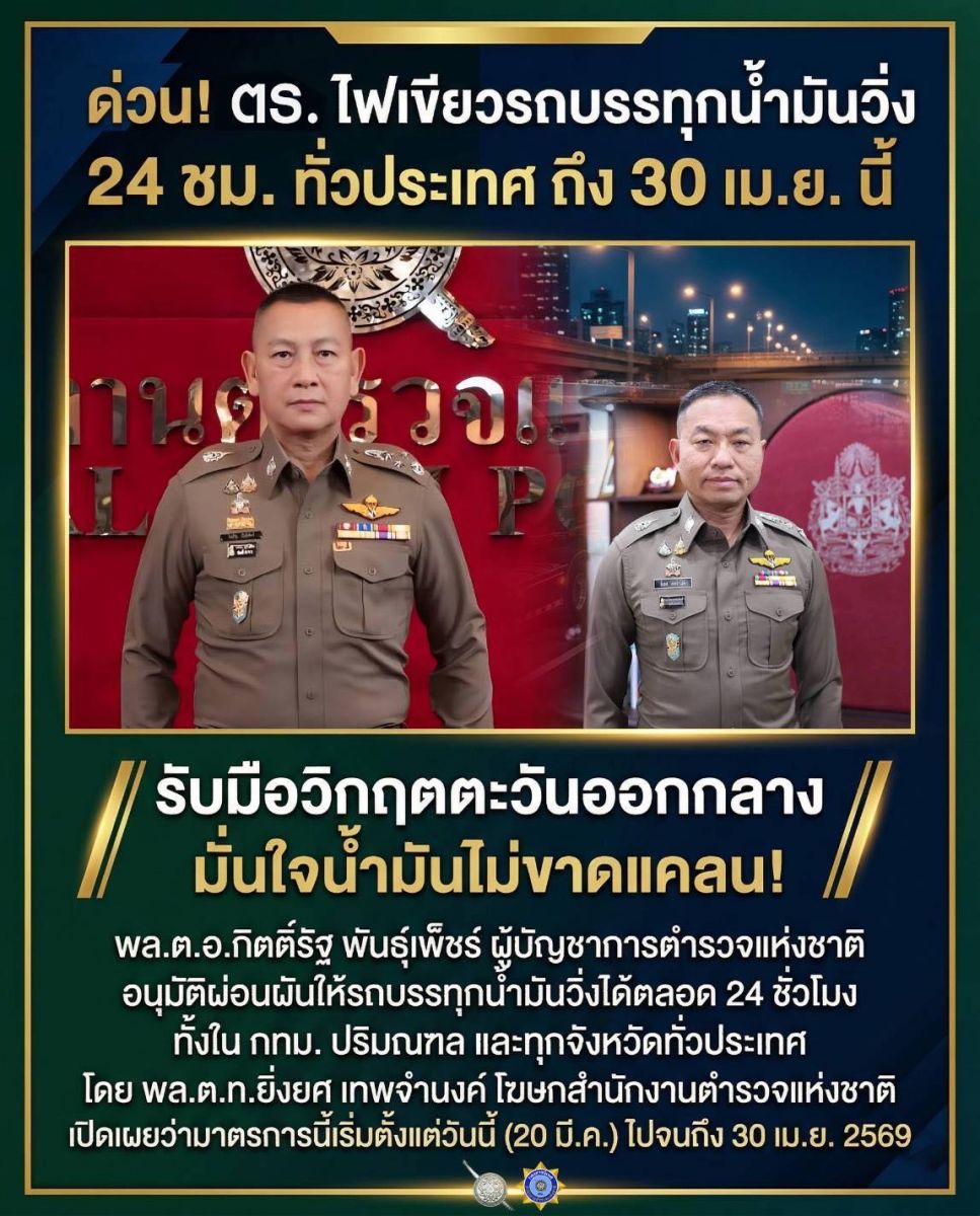 พล.ต.ท.ยิ่งยศ เทพจำนงค์ ผู้ช่วยผู้บัญชาการตำรวจแห่งชาติ ในฐานะโฆษกสำนักงานตำรวจแห่งชาติ เปิดเผยว่า พล.ต.อ.กิตติ์รัฐ พันธุ์เพ็ชร์ ผู้บัญชาการตำรวจแห่งชาติ ในฐานะหัวหน้าเจ้าพนักงานจราจรทั่วราชอาณาจักร ได้พิจารณาออกข้อบังคับ ผ่อนผันให้รถบรรทุกน้ำมันเชื้อเพลิงสามารถวิ่งได้ตลอด 24 ชั่วโมง ทั้งใน กทม. ปริมณฑล และทุกจังหวัดทั่วไทย เพื่อรับมือผลกระทบจากวิกฤตการณ์ตะวันออกกลาง