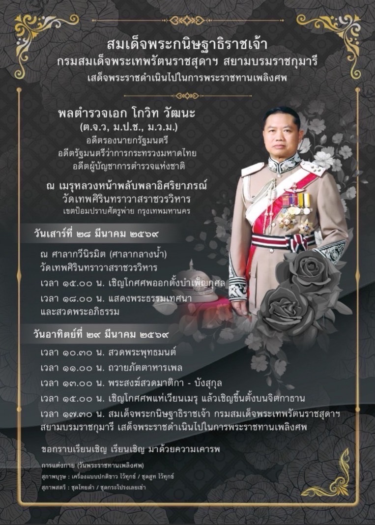 สมเด็จพระกนิษฐาธิราชเจ้า กรมสมเด็จพระเทพรัตนราชสุดาฯ สยามบรมราชกุมารี ทรงพระกรุณาโปรดเกล้าโปรดกระหม่อม เสด็จพระราชดำเนินไปในการพระราชทานเพลิงศพ พล.ต.อ.โกวิท วัฒนะ (ต.จ.ว, ม.ป.ช., ม.ว.ม.) อดีตรองนายกรัฐมนตรี อดีตรัฐมนตรีว่าการกระทรวงมหาดไทย อดีตผู้บัญชาการตำรวจแห่งชาติ ในวันอาทิตย์ ที่ 29 มีนาคม 2569 เวลา 17.30 น. ณ เมรุหลวงหน้าพลับพลาอิศริยาภรณ์ วัดเทพศิรินทราวาสราชวรวิหาร เขตป้อมปราบศัตรูพ่าย กรุงเทพมหานคร