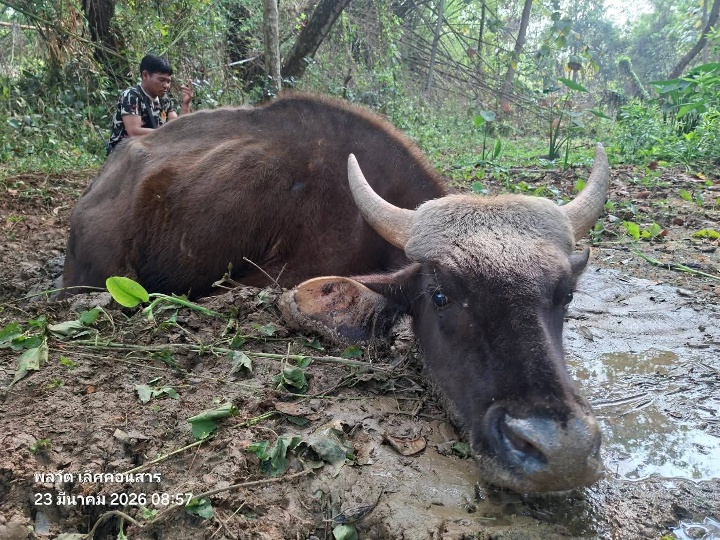 เจ้าหน้าที่เขตห้ามล่าสัตว์ป่าเขาแผงม้า รุดช่วยกระทิงป่าติดหล่มโคลนลึกกลางป่าคลองทราย ก่อนส่งกลับคืนสู่ธรรมชาติอย่างปลอดภัย
