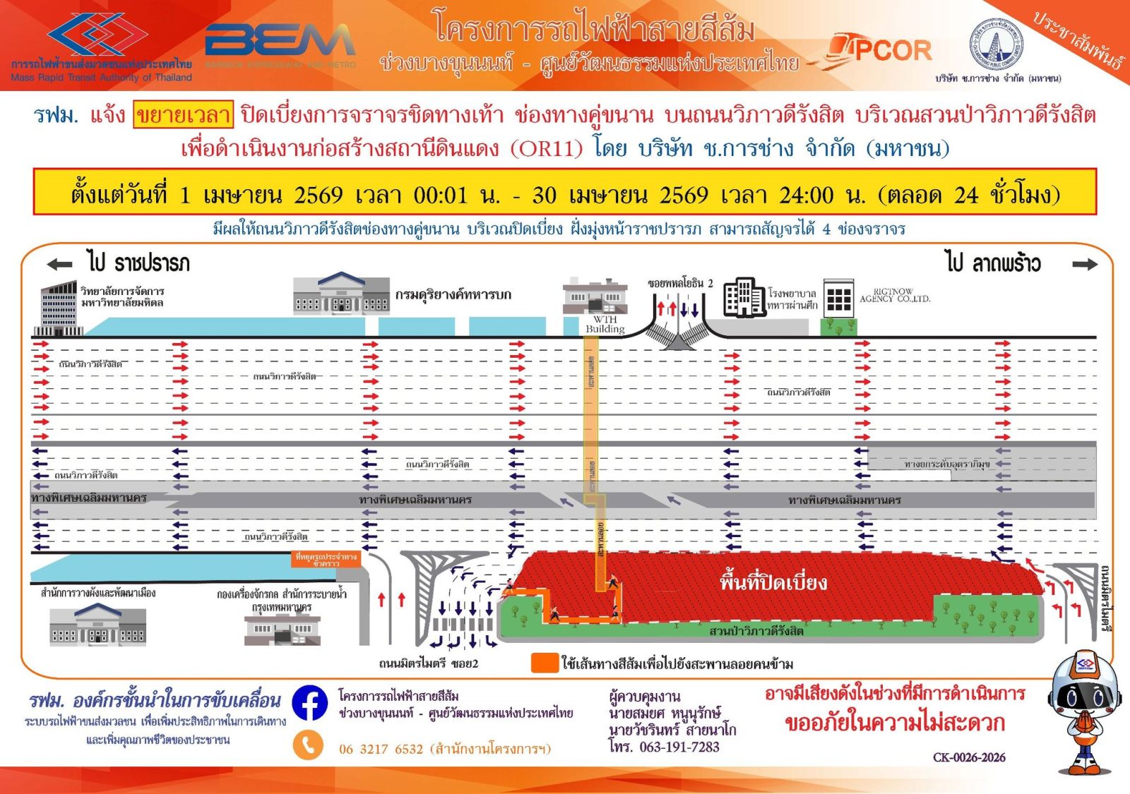 การรถไฟฟ้าขนส่งมวลชนแห่งประเทศไทย (รฟม.) แจ้งว่า บริษัท ช.การช่าง จำกัด (มหาชน) ผู้รับจ้างออกแบบและก่อสร้างอุโมงค์ทางวิ่งและสถานีใต้ดิน โครงการรถไฟฟ้าสายสีส้ม ช่วงบางขุนนนท์ – ศูนย์วัฒนธรรมแห่งประเทศไทย มีความจำเป็นต้องขยายเวลาปิดเบี่ยงการจราจรชิดทางเท้า 2 ช่องจราจร ช่องทางคู่ขนาน บนถนนวิภาวดีรังสิต บริเวณสวนป่าวิภาวดีรังสิต เพื่อดำเนินงานก่อสร้างสถานีดินแดง (OR11) ตั้งแต่วันที่ 1 เมษายน 2569 เวลา 00:01 น. – 30 เมษายน 2569 เวลา 24:00 น. (ตลอด 24 ชั่วโมง) มีผลให้ถนนวิภาวดีรังสิตช่องคู่ขนาน บริเวณปิดเบี่ยง ฝั่งมุ่งหน้าราชปรารภ สามารถสัญจรได้ 4 ช่องจราจรโดยประชาชนสามารถเข้า – ออกที่พักอาศัยได้ตามปกติ