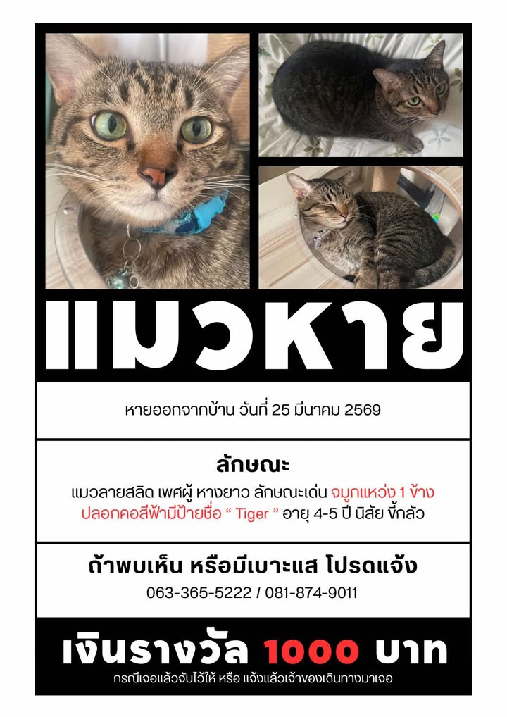 ตามหา “Tiger” แมวลายสลิด เพศผู้ อายุ 4-5 ปี หางยาว ลักษณะเด่น จมูกแหว่ง 1 ข้าง ปลอกคอสีฟ้ามีป้ายชื่อ นิสัย ขี้กลัว