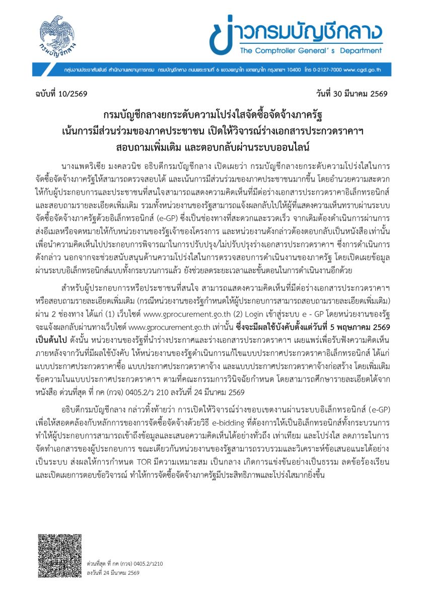 (30 มี.ค.69) นางแพตริเซีย มงคลวนิช อธิบดีกรมบัญชีกลาง เปิดเผยว่า กรมบัญชีกลางยกระดับความโปร่งใสในการจัดซื้อจัดจ้างภาครัฐให้สามารถตรวจสอบได้ และเน้นการมีส่วนร่วมของภาคประชาชนมากขึ้น โดยอำนวยความสะดวกให้กับผู้ประกอบการและประชาชนที่สนใจสามารถแสดงความคิดเห็นที่มีต่อร่างเอกสารประกวดราคาอิเล็กทรอนิกส์ และสอบถามรายละเอียดเพิ่มเติม รวมทั้งหน่วยงานของรัฐสามารถแจ้งผลกลับไปให้ผู้ที่แสดงความเห็นทราบผ่านระบบจัดซื้อจัดจ้างภาครัฐด้วยอิเล็กทรอนิกส์ (e-GP) ซึ่งเป็นช่องทางที่สะดวกและรวดเร็ว จากเดิมต้องดำเนินการผ่านการส่งอีเมลหรือจดหมายให้กับหน่วยงานของรัฐเจ้าของโครงการ และหน่วยงานดังกล่าวต้องตอบกลับเป็นหนังสือเท่านั้น เพื่อนำความคิดเห็นไปประกอบการพิจารณาในการปรับปรุง/ไม่ปรับปรุงร่างเอกสารประกวดราคาฯ ซึ่งการดำเนินการดังกล่าว นอกจากจะช่วยสนับสนุนด้านความโปร่งใสในการตรวจสอบการดำเนินงานของภาครัฐ โดยเปิดเผยข้อมูลผ่านระบบอิเล็กทรอนิกส์แบบทั้งกระบวนการแล้ว ยังช่วยลดระยะเวลาและขั้นตอนในการดำเนินงานอีกด้วย