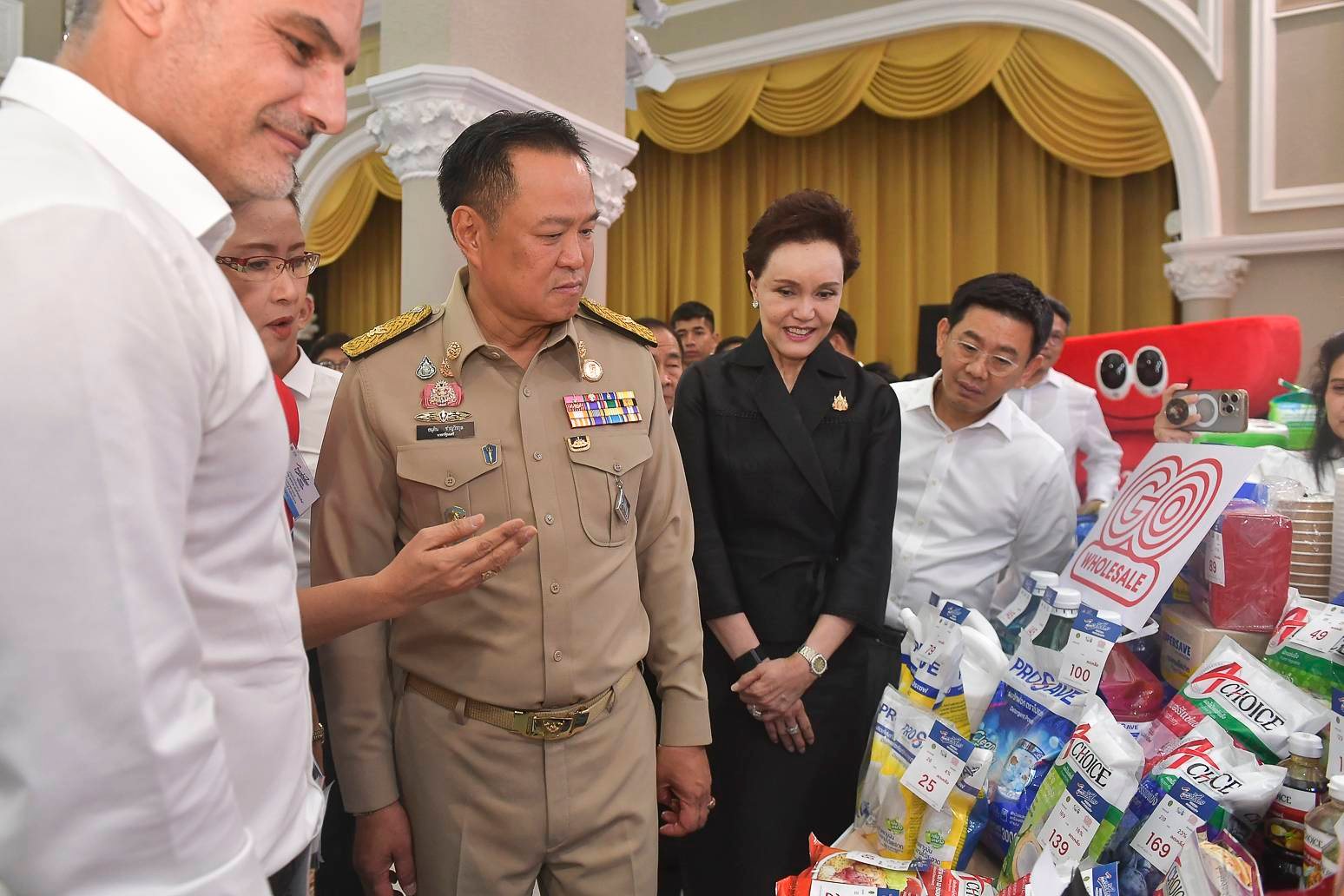 พร้อมกันนี้ นายกรัฐมนตรี และรัฐมนตรีว่าการกระทรวงพาณิชย์ ได้เยี่ยมชมบูธแสดงสินค้าจากห้างค้าส่งและค้าปลีกสมัยใหม่ (Modern Trade) รวมถึงผู้ผลิตและผู้แทนจำหน่าย (Suppliers) ที่นำเสนอสินค้าราคาพิเศษที่เข้าร่วมลดราคาภายใต้โครงการ “ไทยช่วยไทย” ลดภาระ ลดค่าครองชีพ” มาแสดง ณ บริเวณโถงกลาง ตึกสันติไมตรี โดย นายกรัฐมนตรี ได้ร่วมอุดหนุนสินค้าหลากหลายรายการ อาทิ ยาสี โฟมล้างมือ ข้าวสาร น้ำยาล้างจาน และกระดาษทิชชู เป็นต้น