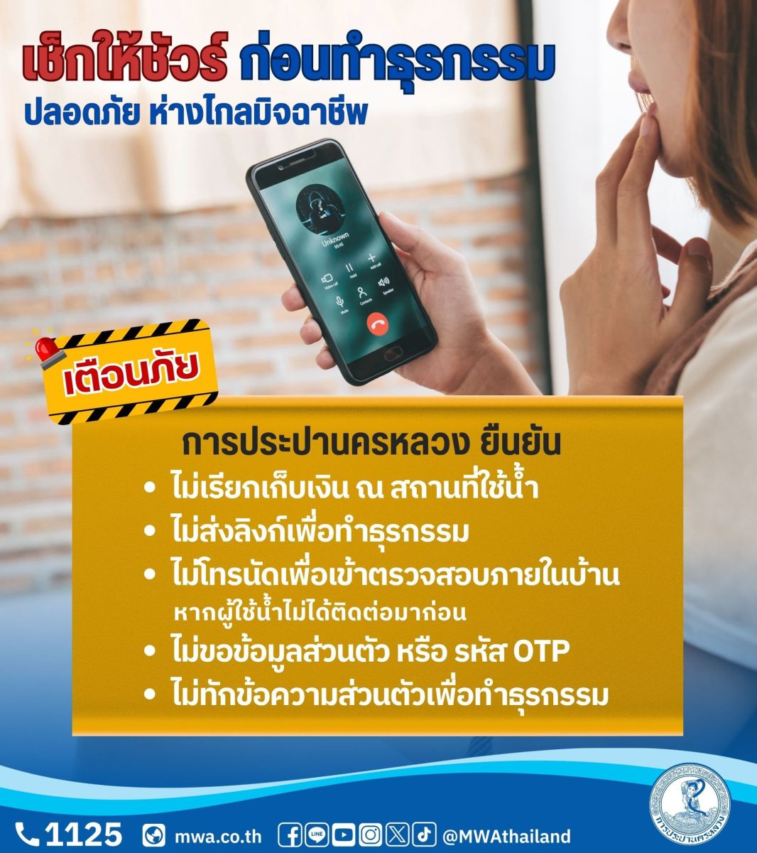 การประปานครหลวง (กปน.) แจ้งเตือนประชาชนให้เพิ่มความระมัดระวัง หลังยังพบกลุ่มมิจฉาชีพแอบอ้างเป็นเจ้าหน้าที่หน่วยงานรัฐ ติดต่อผ่านโทรศัพท์ ข้อความ SMS และสื่อสังคมออนไลน์ เช่น Facebook และ Instagram เพื่อหลอกขอข้อมูลส่วนบุคคล หรือชักชวนให้ทำธุรกรรมทางการเงิน