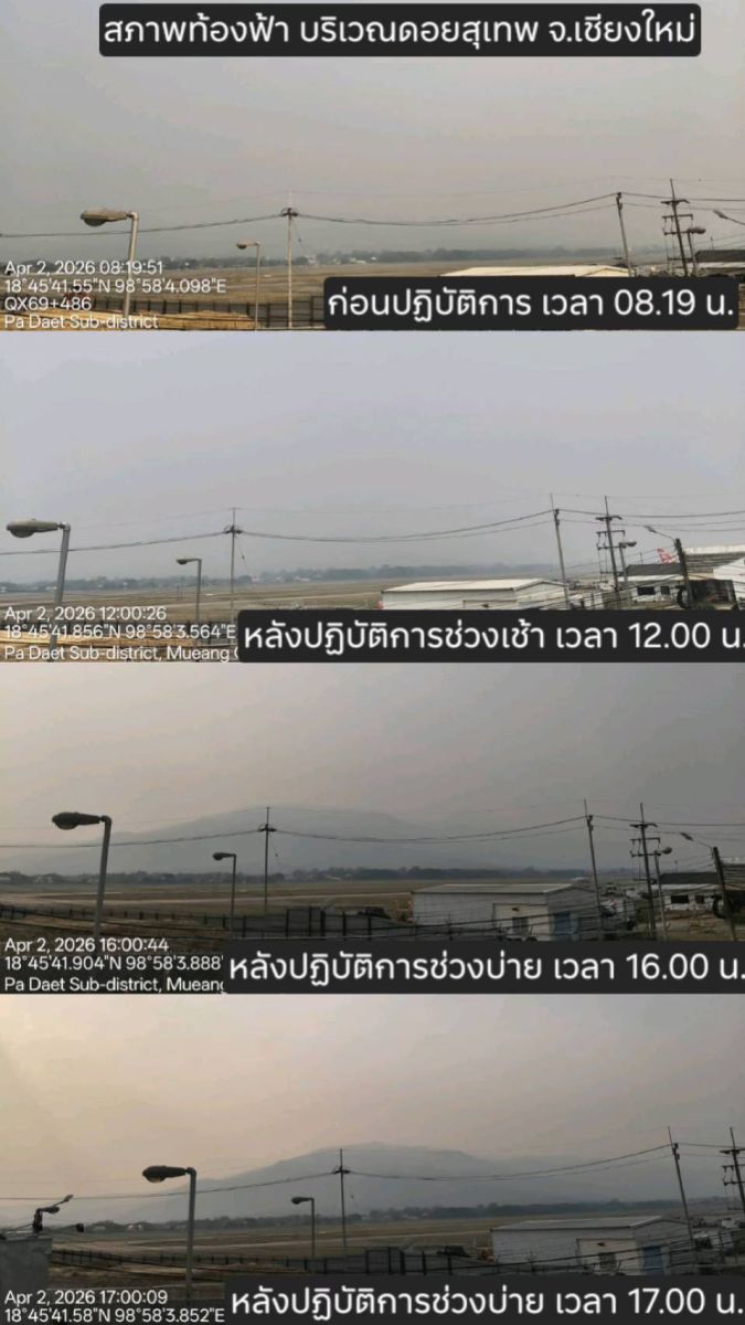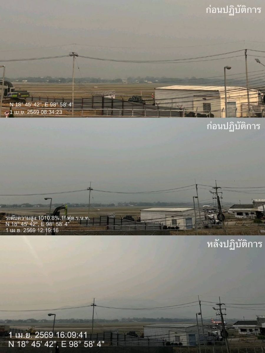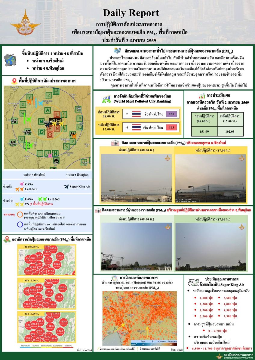 วันที่ 3 เมษายน 2569 ศูนย์ปฏิบัติฝนหลวงภาคเหนือ เปิดเผยข้อมูลว่า จากการที่ได้เดินหน้าปฏิบัติการ “ทวงคืนอากาศบริสุทธิ์” อย่างเป็นทางการ ตั้งแต่วันที่ 1 เมษายน 2569 ที่ผ่านมา ซึ่งกรมฝนหลวงและการบินเกษตรได้ส่งเครื่องบินรวม 4 ลำ ได้แก่ เครื่องบิน Kasa 2 ลำ และ L410 อีก 2 ลำ เข้าสนับสนุนภารกิจเร่งแก้ปัญหาฝุ่น PM2.5 โดยใช้เทคนิคทางวิทยาศาสตร์ 3 รูปแบบ ได้แก่ การก่อเมฆ การเลี้ยงเมฆ และการเจาะชั้นบรรยากาศร้อน เพื่อช่วยเร่งการระบายฝุ่นละอองขนาดเล็กออกจากชั้นอากาศที่ปกคลุมพื้นที่