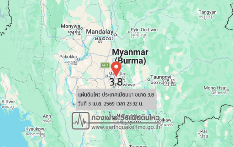 วันที่ 3 เมษายน 2569 เวลา 23.32 น. กองเฝ้าระวังแผ่นดินไหว กรมอุตุนิยมวิทยา แจ้งเหตุ แผ่นดินไหว ขนาด 3.8 ความลึก 10 กม. ภายในพื้นที่ของประเทศเมียนมา ศูนย์กลางห่างออกไปทางทิศตะวันตกเฉียงเหนือของ อ.เมือง จ.แม่ฮ่องสอน ประมาณ 260 กม. ยังไม่มีรายงานผลกระทบต่อประเทศไทย