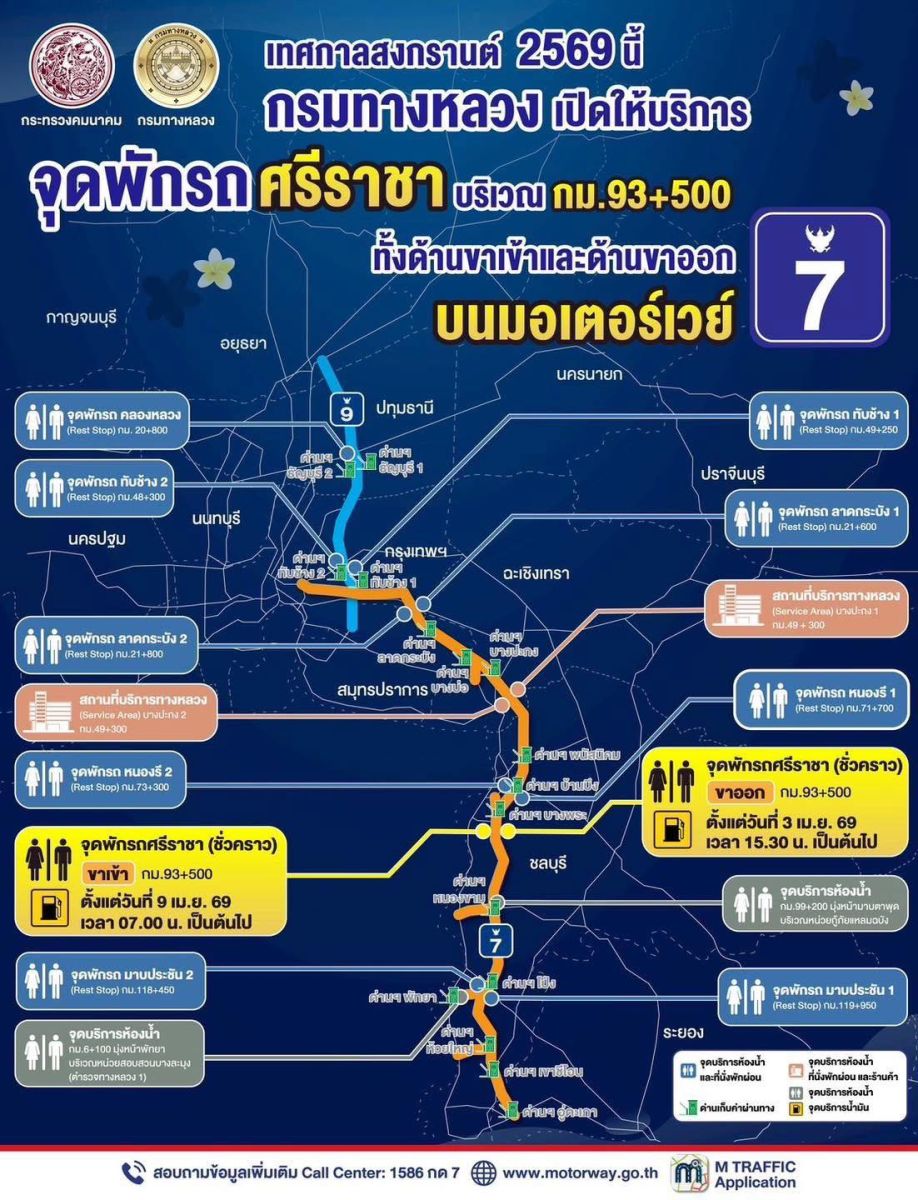สงกรานต์นี้... แวะพักได้ตลอดทาง! กรมทางหลวงพร้อมให้บริการ 15 จุดพักรถมอเตอร์เวย์ M7 - M9