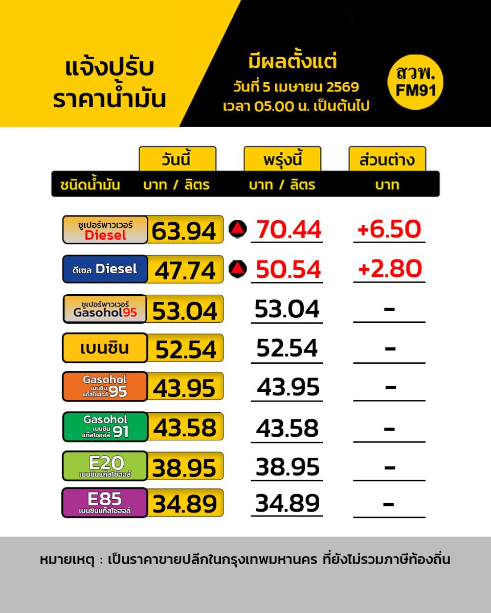มีผลวันที่ 5 เม.ย. 69 ตั้งแต่ เวลา 05.00 น. เป็นต้นไป