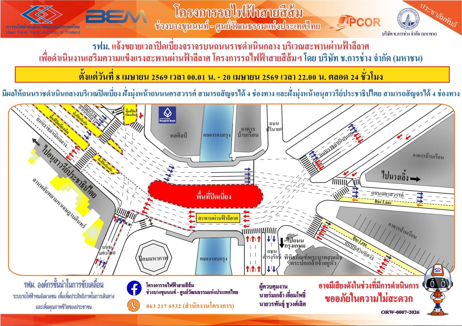 ประชาสัมพันธ์ #แจ้งขยายเวลาปิดเบี่ยงจราจรบนถนนราชดำเนินกลาง บริเวณสะพานผ่านฟ้าลีลาศ เพื่อดำเนินงานเสริมความแข็งแรงสะพานผ่านฟ้าลีลาศ โครงการรถไฟฟ้าสายสีส้มฯ ตั้งแต่วันที่ 8 เมษายน 2569 เวลา 00.01 น. – 20 เมษายน 2569 เวลา 22.00 น. ตลอด 24 ชั่วโมง