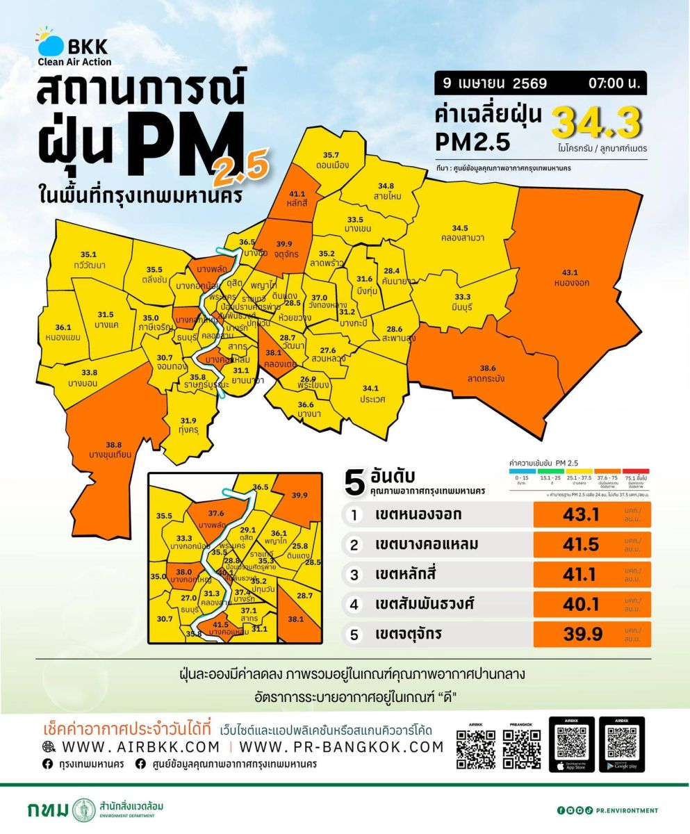 ศูนย์ข้อมูลคุณภาพอากาศกรุงเทพมหานคร ขอรายงานสถานการณ์ฝุ่นละอองขนาดไม่เกิน 2.5 ไมครอน (PM 2.5) ในกรุงเทพมหานคร ประจำวันที่ 9 เมษายน 2569 เวลา 07:00 น. ค่าเฉลี่ยของกรุงเทพมหานคร 34.3 ไมโครกรัมต่อลูกบาศก์เมตร (มคก./ลบ.ม.) (ค่ามาตรฐานไม่เกิน 37.5 มค.ก./ลบ.ม.)
