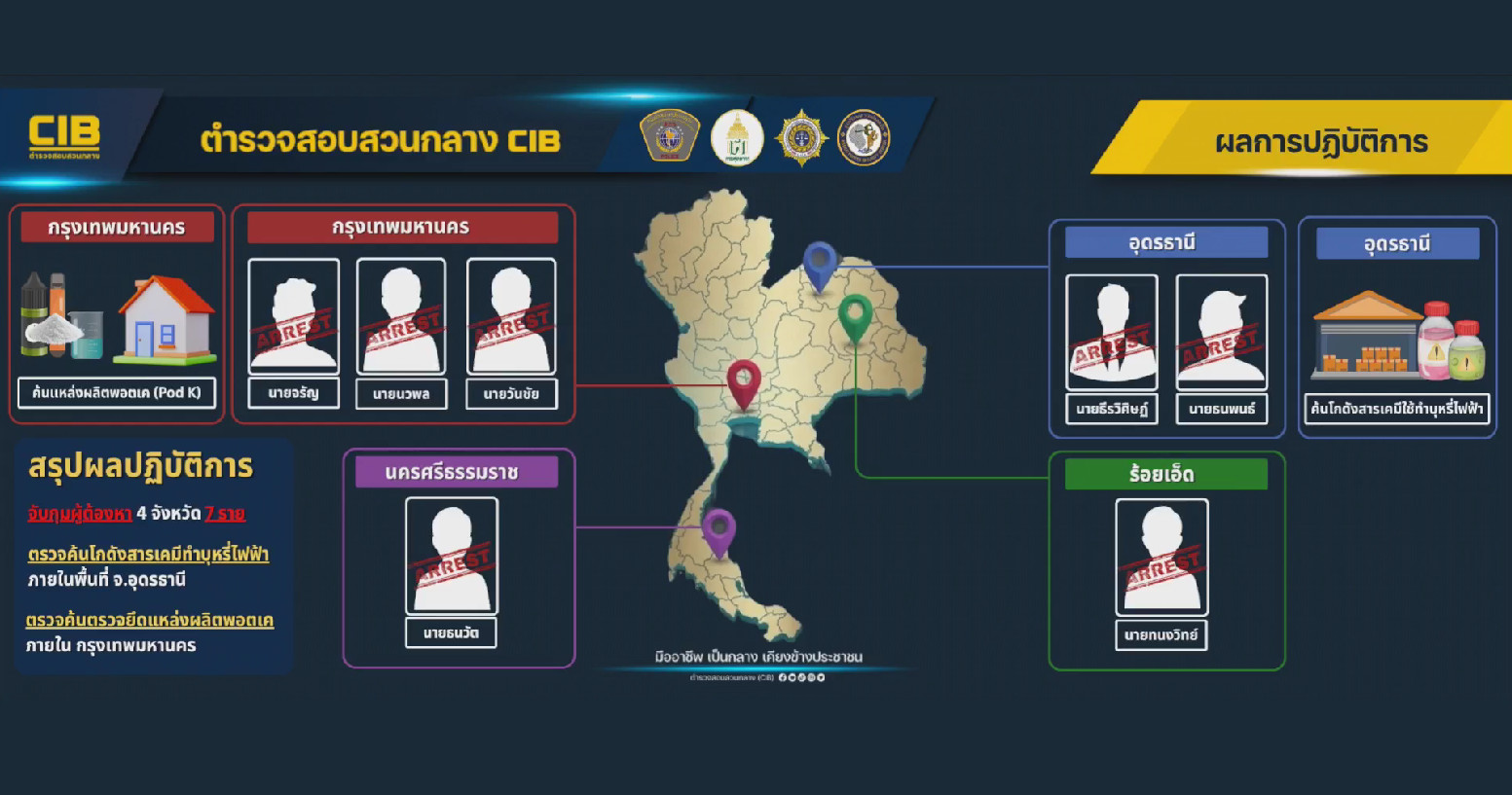 9 เม.ย.69 ที่ กองบัญชาการตำรวจสอบสวนกลาง (CIB) กองบังคับการปราบปรามการกระทำความผิดเกี่ยวกับอาชญากรรมทางเศรษฐกิจ โดย พล.ต.ท.ณัฐศักดิ์ เชาวนาศัย ผบช.ก. ร่วมกับ กรมศุลกากร, ป.ป.ส. ร่วมลงพื้นที่ตรวจค้นจับกุมผู้ต้องหา ทั้งสิ้น 7 ราย ในพื้นที่ 4 จังหวัด ได้แก่ กรุงเทพมหานคร , จ.อุดรธานี , จ.ร้อยเอ็ด และ จ.นครศรีธรรมราช โดยตรวจค้นสถานที่ 3 จุด ได้แก่