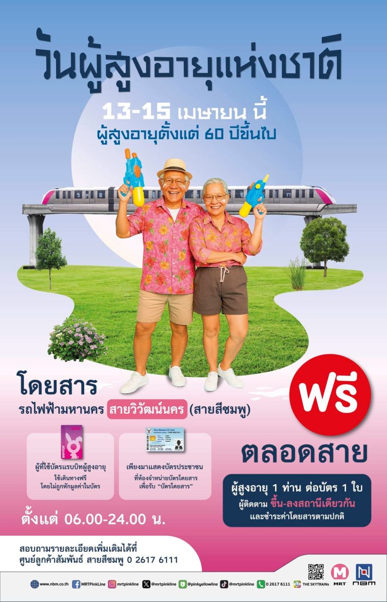 ในโอกาสนี้ การรถไฟฟ้าขนส่งมวลชนแห่งประเทศไทย (รฟม.) และ บริษัทผู้รับสัมปทานให้บริการรถไฟฟ้ามหานครทุกสาย ขอส่งความสุขในเทศกาลสงกรานต์และวันผู้สูงอายุแห่งชาติปี 2569 ยกเว้นค่าโดยสารรถไฟฟ้า มหานคร (รถไฟฟ้า MRT) ทั้ง 4 สาย ได้แก่ รถไฟฟ้ามหานคร สายฉลองรัชธรรม (MRT สายสีม่วง) รถไฟฟ้ามหานคร สายเฉลิมรัชมงคล (MRT สายสีน้ำเงิน) รถไฟฟ้ามหานคร สายนัคราพิพัฒน์ (MRT สายสีเหลือง) และรถไฟฟ้ามหานคร สายวิวัฒน์นคร (MRT สายสีชมพู) ให้แก่ผู้โดยสารที่มีอายุ 60 ปีบริบูรณ์ขึ้นไป ในระหว่างวันที่ 13 – 15 เมษายน 2569 ตลอดระยะเวลาให้บริการ โดยผู้สูงอายุสามารถแสดงบัตรประจำตัวประชาชนเพื่อขอรับคูปอง/บัตรโดยสารรถไฟฟ้าฟรี (1 คนต่อ 1 ใบเท่านั้น) ได้ที่ห้องออกบัตรโดยสารประจำสถานีรถไฟฟ้าทุกสถานี ทั้งนี้ เพื่อเป็นการอำนวยความสะดวกและส่งเสริมการใช้ระบบขนส่งสาธารณะในช่วงเทศกาลสงกรานต์ 2569 สอดคล้องตามมาตรการประหยัดพลังงานของรัฐบาล พร้อมทั้งส่งเสริมสถาบันครอบครัวในการพาผู้สูงอายุเดินทางท่องเที่ยวสถานที่ต่างๆ รอบเส้นทางรถไฟฟ้า MRT