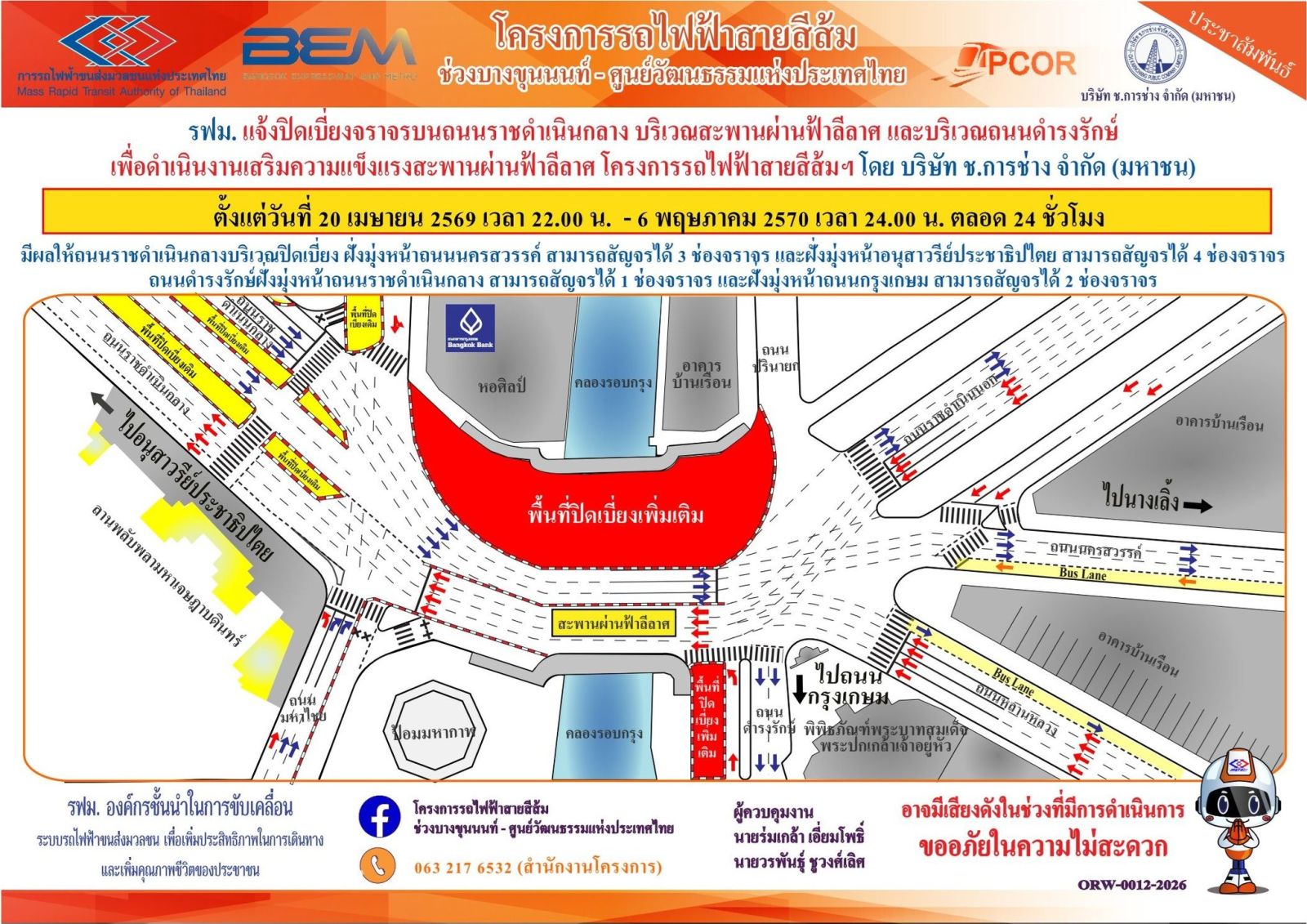 การรถไฟฟ้าขนส่งมวลชนแห่งประเทศไทย (รฟม.) แจ้งว่า บริษัท ช.การช่าง จำกัด (มหาชน) ผู้รับจ้างออกแบบและก่อสร้างอุโมงค์ทางวิ่งและสถานีใต้ดิน โครงการรถไฟฟ้าสายสีส้ม ช่วงบางขุนนนท์ – ศูนย์วัฒนธรรมแห่งประเทศไทย มีความจำเป็นต้องปิดเบี่ยงจราจรบนถนนราชดำเนินกลาง 6 ช่องจราจร บริเวณสะพานผ่านฟ้าลีลาศ และบริเวณถนนดำรงรักษ์ 1 ช่องจราจร เพื่อดำเนินงานเสริมความแข็งแรงสะพานผ่านฟ้าลีลาศ โครงการรถไฟฟ้าสายสีส้มฯ ตั้งแต่วันที่ 20 เมษายน 2569 เวลา 22.00 น. – 6 พฤษภาคม 2570 เวลา 24.00 น. ตลอด 24 ชั่วโมง