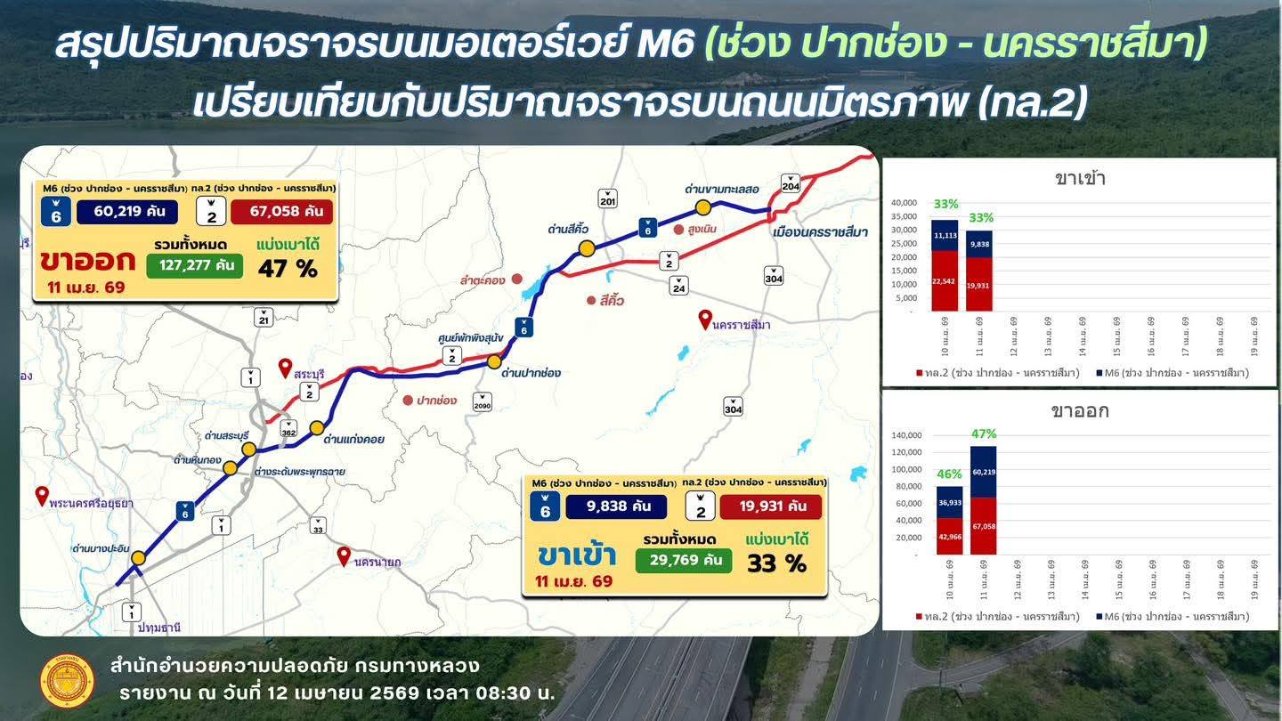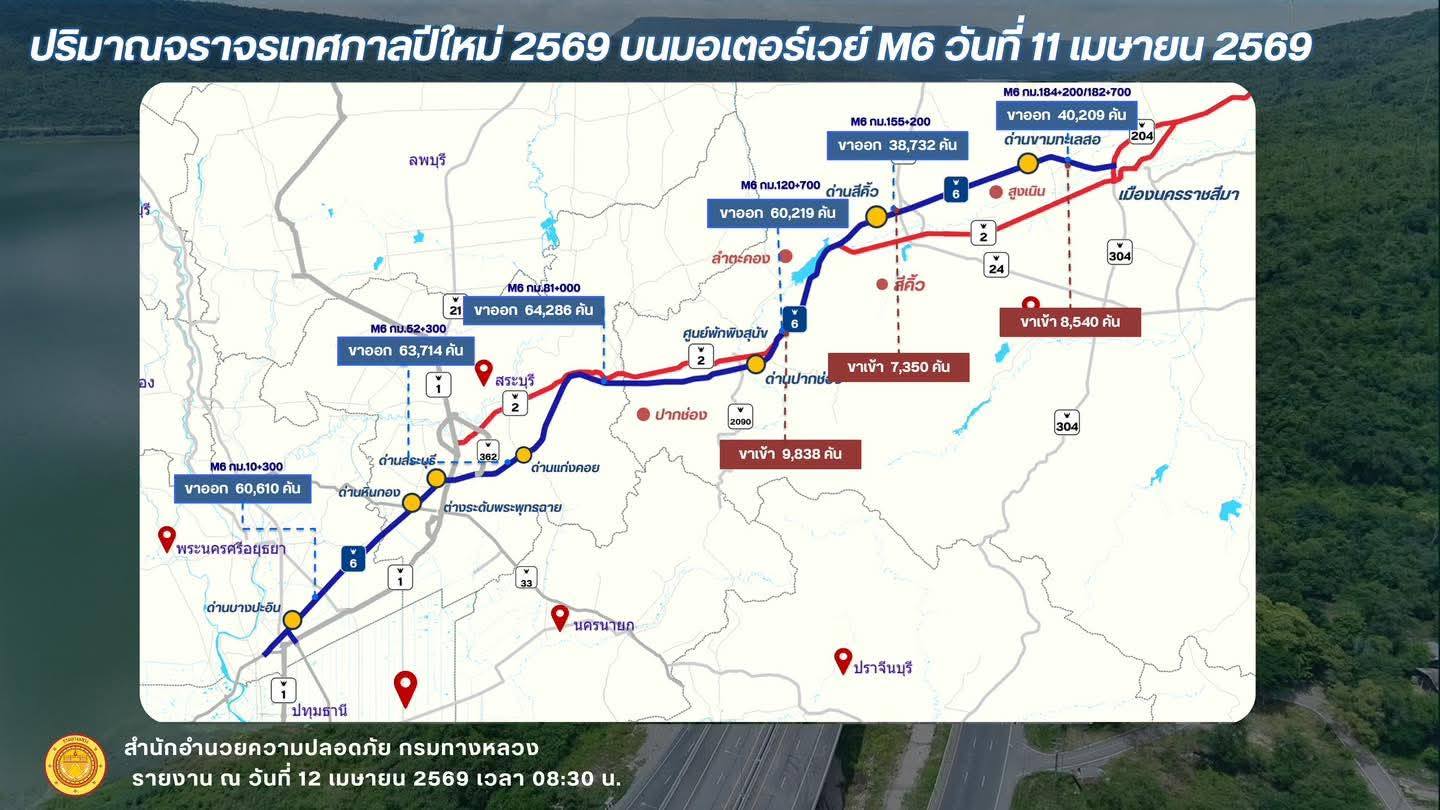 วันนี้ (12 เมษายน 2569) กรมทางหลวง สำนักอำนวยความปลอดภัยเปิดเผยว่า ปริมาณจราจรจากการเปิดให้บริการมอเตอร์เวย์ M6 สายบางปะอิน – นครราชสีมา ในวันที่ 11 เมษายน 2569 ซึ่งเป็นช่วงเริ่มต้นเทศกาลสงกรานต์ พบว่ามีปริมาณจราจรใช้เส้นทางอย่างต่อเนื่อง และสามารถช่วยแบ่งเบาการจราจรบนทางหลวงสายหลักได้อย่างมีประสิทธิภาพ