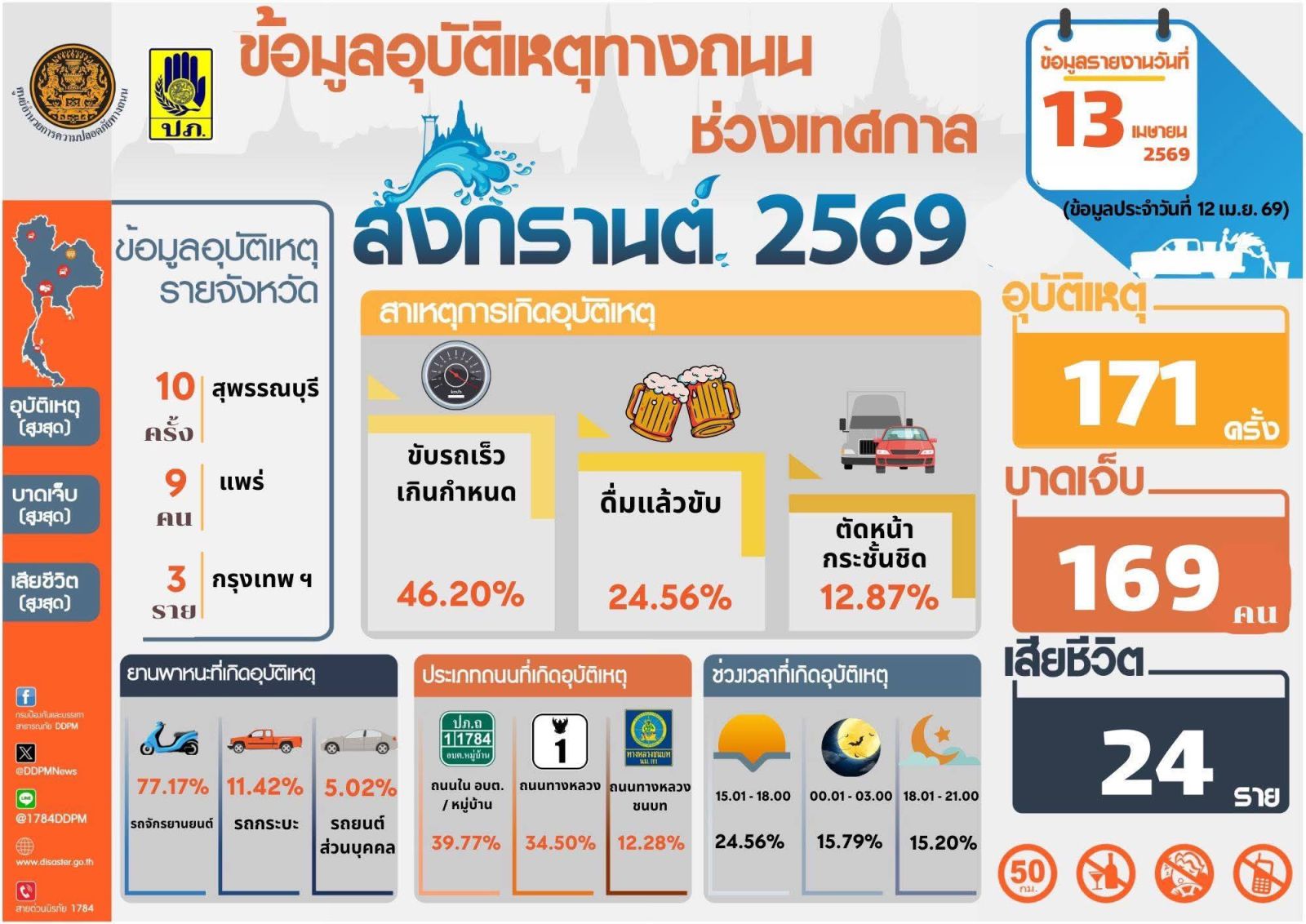 นายผดุงศักดิ์ สรุจิกำจรวัฒนะ ผู้ตรวจราชการกระทรวงคมนาคม ในฐานะประธานแถลงข่าวสรุปผลการดำเนินงานของศูนย์อำนวยการป้องกันและลดอุบัติเหตุทางช่วงเทศกาลสงกรานต์ พ.ศ. 2569 เปิดเผยว่า ศปถ. ได้รวบรวมสถิติอุบัติเหตุทางถนน ประจำวันที่ 12 เม.ย. 2569 ซึ่งเป็นวันที่สามของการรณรงค์ “ขับขี่ปลอดภัย ลดความเร็ว ลดอุบัติเหตุ” เกิดอุบัติเหตุ 171 ครั้ง ผู้บาดเจ็บ 169 คน ผู้เสียชีวิต 24 ราย สาเหตุที่ทำให้เกิดอุบัติเหตุสูงสุด ได้แก่ ขับรถเร็ว ร้อยละ 46.20 ดื่มแล้วขับ ร้อยละ 24.56 ยานพาหนะที่เกิดอุบัติเหตุสูงสุด ได้แก่ รถจักรยานยนต์ ร้อยละ 77.17 ส่วนใหญ่เกิดบนเส้นทางตรง ร้อยละ 81.29 ถนนใน อบต./หมู่บ้าน ร้อยละ 39.77 ถนนกรมทางหลวง ร้อยละ 34.50 ช่วงเวลาที่เกิดอุบัติเหตุสูงสุด ได้แก่ ช่วงเวลา 15.01 –18.00 น. ร้อยละ 24.56 ผู้บาดเจ็บและเสียชีวิตสูงสุด อยู่ในช่วงอายุ 20 - 29 ปี ร้อยละ 22.80 โดยจังหวัดที่เกิดอุบัติเหตุสูงสุด ได้แก่ สุพรรณบุรี (10 ครั้ง) จังหวัดที่มีผู้บาดเจ็บสูงสุด ได้แก่ แพร่ (9 คน) จังหวัดที่มีผู้เสียชีวิตสูงสุด ได้แก่ กรุงเทพมหานคร (3 ราย)
