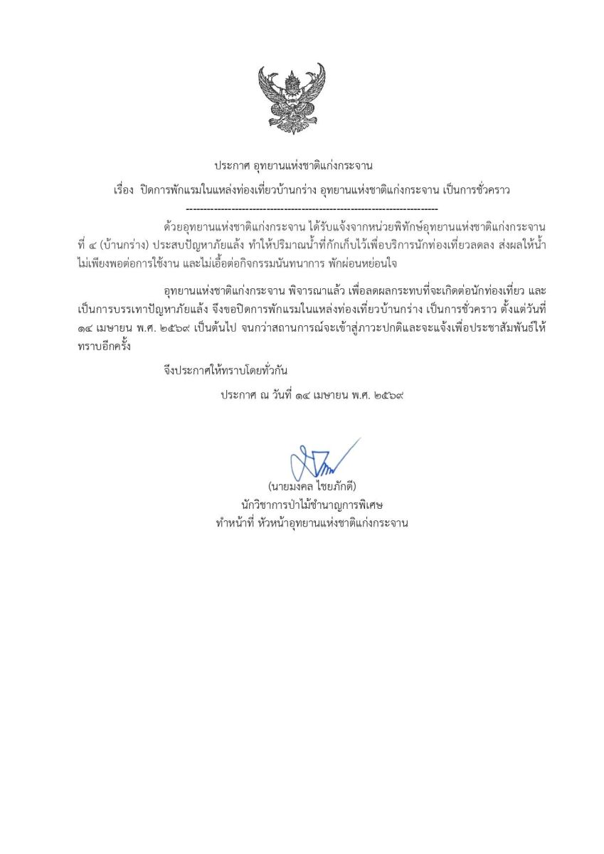 อุทยานแห่งชาติแก่งกระจาน พิจารณาแล้ว เพื่อลดผลกระทบที่จะเกิดต่อนักท่องเที่ยว และเป็นการบรรเทาปัญหาภัยแล้ง จึงขอปิดการพักแรมในแหล่งท่องเที่ยวบ้านกร่างเป็นการชั่วคราว ตั้งแต่วันที่ 14 เม.ย. 69 เป็นต้นไป จนกว่าสถานการณ์จะเข้าสู่ภาวะปกติและจะแจ้งเพื่อประชาสัมพันธ์ให้ทราบอีกครั้ง