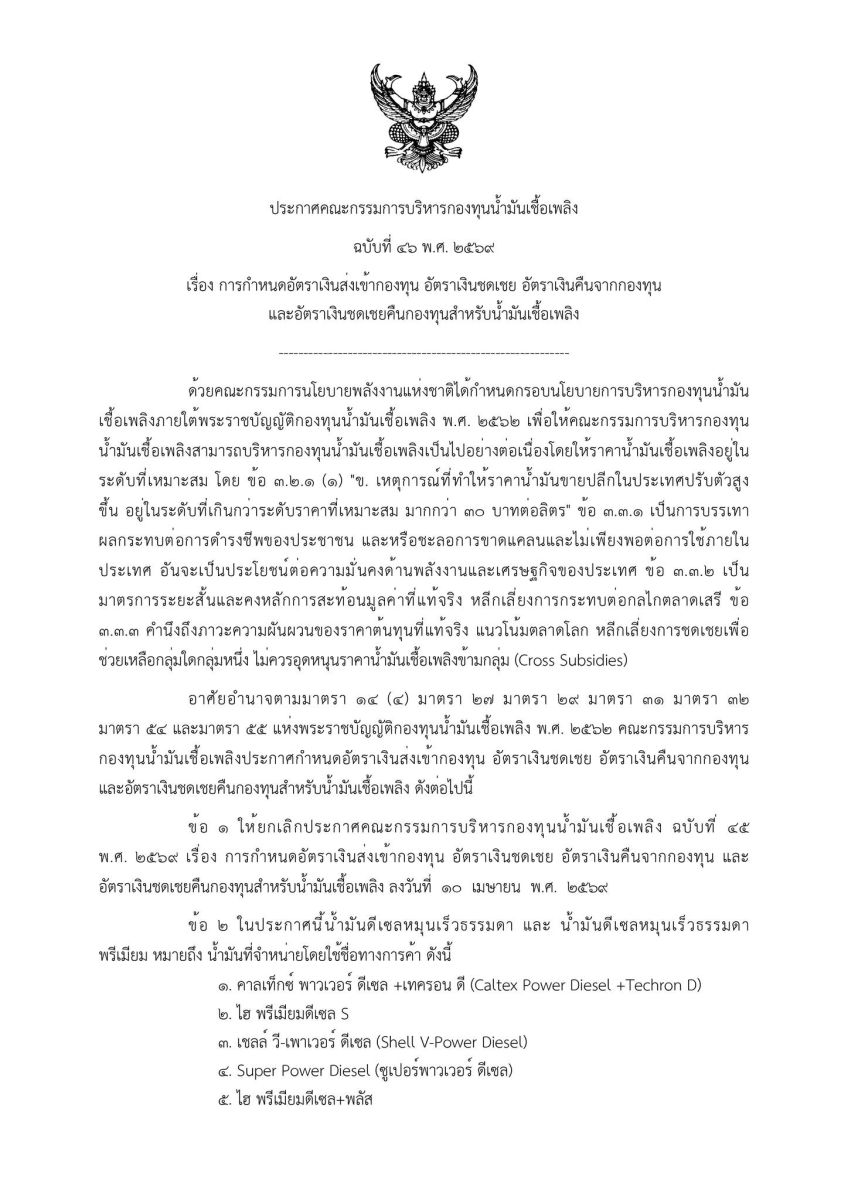 วันที่ 14 เมษายน 2569 สำนักงานกองทุนน้ำมันเชื้อเพลิง เผยแพร่ประกาศ ประกาศคณะกรรมการบริหารกองทุนน้ำมันเชื้อเพลิง ฉบับที่ 46 พ.ศ.2569 เรื่อง การกำหนดอัตราเงินส่งเข้ากองทุน อัตราเงินชดเชย อัตราเงินคืนจากกองทุนและอัตราเงินชดเชยคืนกองทุนสำหรับน้ำมันเชื้อเพลิง ประกาศ ณ วันที่ 14 เมษายน 2569