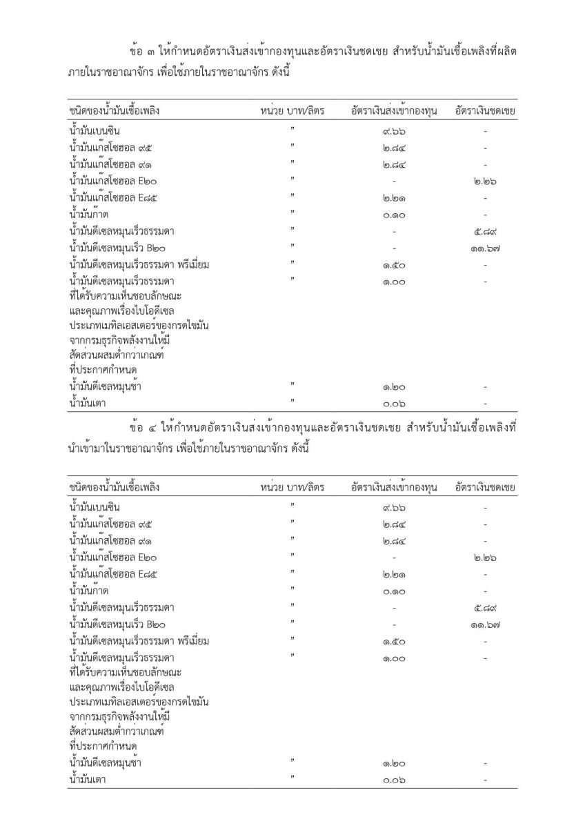 ข้อ 3 ให้กำหนดอัตราเงินส่งเข้ากองทุนและอัตราเงินชดเชย สำหรับน้ำมันเชื้อเพลิงที่ผลิตภายในราชอาณาจักร เพื่อใช้ภายในราชอาณาจักร
