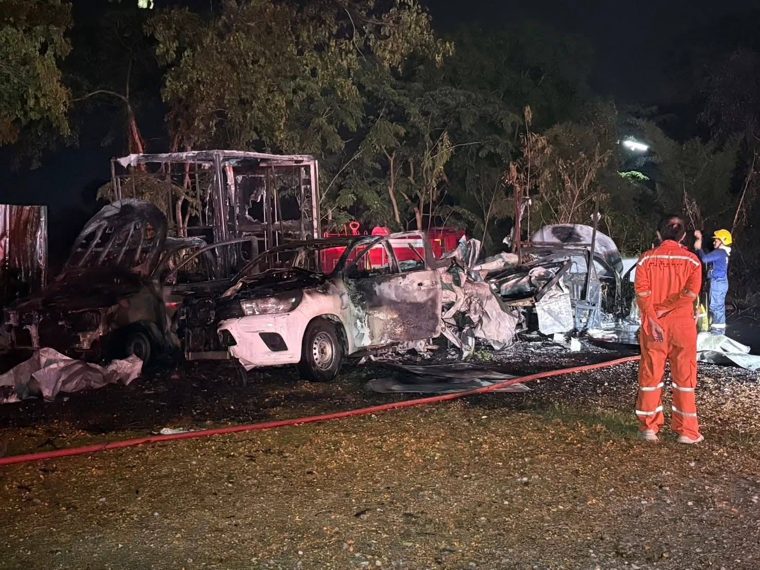 เมื่อเจ้าหน้าที่กู้ภัยและดับเพลิงเข้าตรวจสอบ พบเพลิงกำลังโหมลุกไหม้รถยนต์ในลานจอดอย่างหนักหลายคัน เปลวไฟลุกลามอย่างรวดเร็ว สร้างความเสียหายเป็นวงกว้าง เจ้าหน้าที่จากหลายหน่วยงานต้องเร่งระดมกำลังเข้าควบคุมสถานการณ์ ใช้เวลาจึงสามารถสกัดเพลิงไว้ได้ จากการตรวจสอบเบื้องต้น พบรถยนต์ได้รับความเสียหายจากเพลิงไหม้รวมทั้งสิ้น 4 คัน