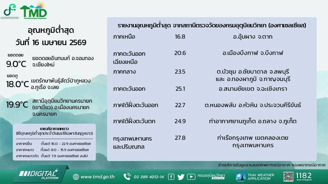 อุณหภูมิต่ำสุดบริเวณประเทศไทย เมื่อเช้าวันนี้ (16 เม.ย. 69) วัดได้ 16.8 องศาเซลเซียส ที่ อ.อุ้มผาง จ.ตาก