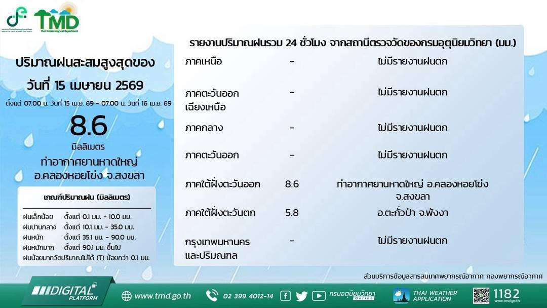 รายงานฝนสะสม 24 ชม.ที่ผ่านมา(15 เม.ย. 69) ตั้งแต่เวลา 07.00 น.ของวันที่ 15 เม.ย. 69 ถึง เวลา 07.00 น. ของวันที่ 16 เม.ย. 69 ของสถานีอุตุนิยมวิทยา มีรายงานฝนตกเล็กน้อย ปริมาณฝนมากที่สุดวัดได้ 8.6 ที่ ท่าอากาศยานหาดใหญ่ อ.คลองหอยโข่ง จ.สงขลา