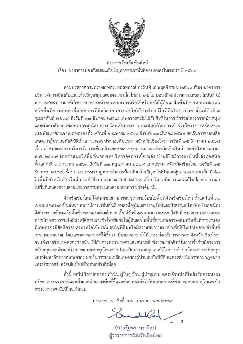 วันที่ 16 เมษายน 2569 ผู้สื่อข่าวรายงาน จังหวัดเชียงใหม่ ออกประกาศมาตรการเข้มงวดในการป้องกันและแก้ไขปัญหาการเผาในพื้นที่การเกษตรที่อยู่ในเขตป่า ประจำปี 2569 โดยมีผลบังคับใช้ตั้งแต่วันที่ 16 เมษายน ถึง 31 พฤษภาคม 2569 เพื่อควบคุมสถานการณ์ไฟป่า หมอกควัน และฝุ่นละอองขนาดเล็ก (PM2.5) ที่ส่งผลกระทบต่อสุขภาพประชาชน