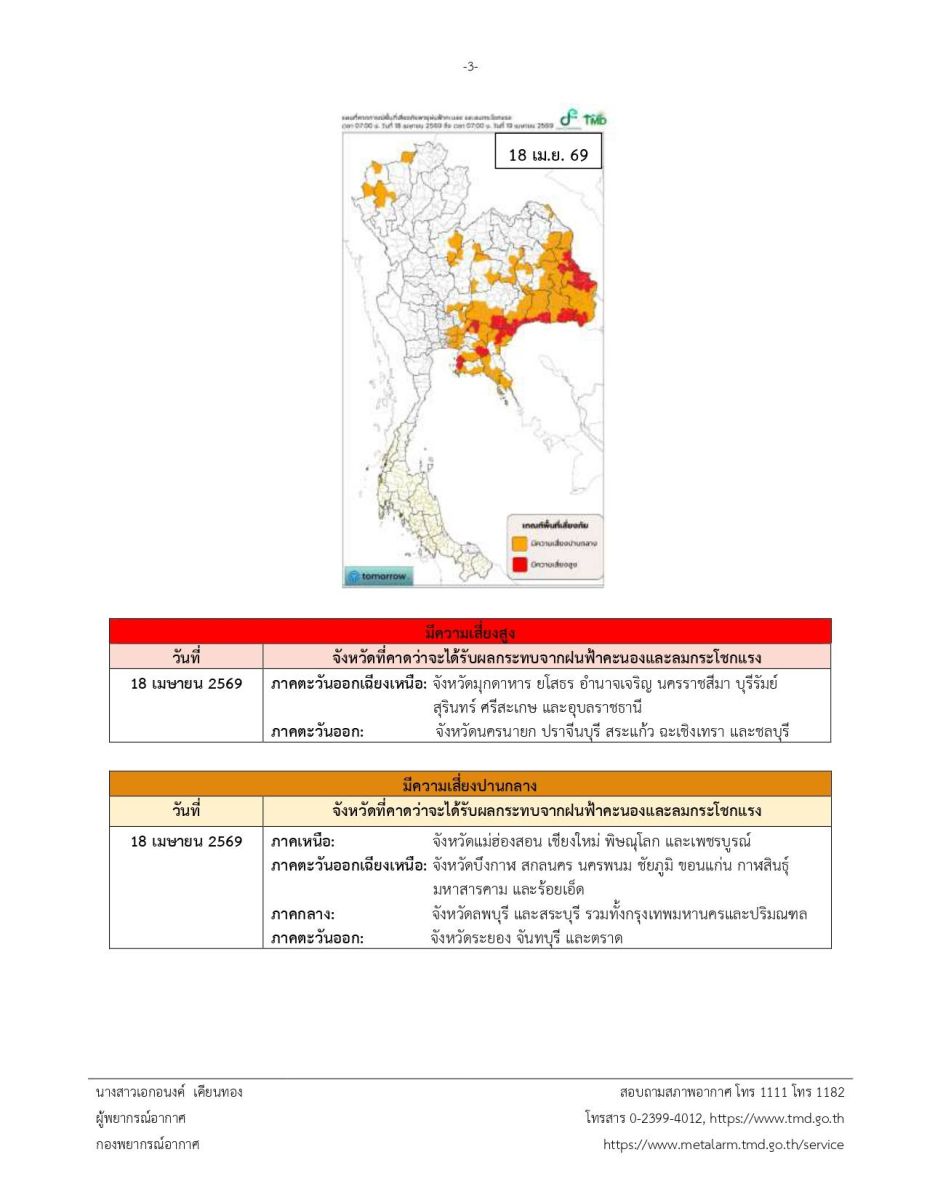 วันที่ 17 เมษายน พ.ศ. 2569 เวลา 05.00 น. กรมอุตุนิยมวิทยา ออกประกาศ ฉบับที่ 6 (25/2569) เรื่อง พายุฤดูร้อนบริเวณประเทศไทยตอนบน (มีผลกระทบจนถึงวันที่ 20 เมษายน 2569)