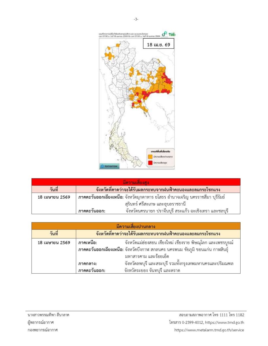 ประกาศกรมอุตุนิยมวิทยา ฉบับที่ 7(26/2569) พายุฤดูร้อนบริเวณประเทศไทยตอนบน (มีผลกระทบถึงวันที่ 20 เมษายน 2569)