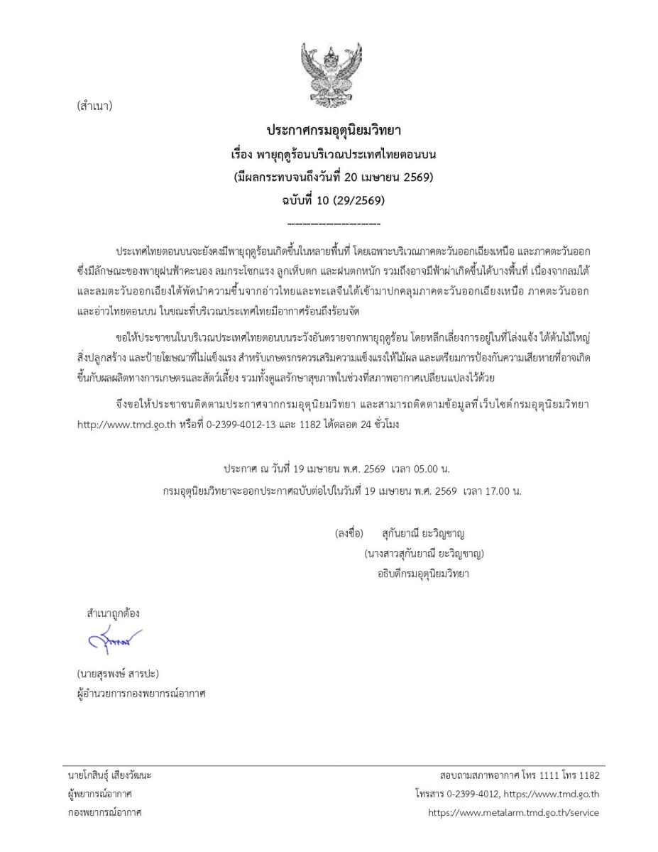 ประกาศกรมอุตุนิยมวิทยา เรื่อง พายุฤดูร้อนบริเวณประเทศไทยตอนบน (มีผลกระทบจนถึงวันที่ 20 เมษายน 2569) ฉบับที่ 10 (29/2569) ประเทศไทยตอนบนจะยังคงมีพายุฤดูร้อนเกิดขึ้นในหลายพื้นที่ โดยเฉพาะบริเวณภาคตะวันออกเฉียงเหนือ และภาคตะวันออก ซึ่งมีลักษณะของพายุฝนฟ้าคะนอง ลมกระโชกแรง ลูกเห็บตก และฝนตกหนัก รวมถึงอาจมีฟ้าผ่าเกิดขึ้นได้บางพื้นที่ เนื่องจากลมใต้และลมตะวันออกเฉียงใต้พัดนำความชื้นจากอ่าวไทยและทะเลจีนใต้เข้ามาปกคลุมภาคตะวันออกเฉียงเหนือ ภาคตะวันออกและอ่าวไทยตอนบนในขณะที่บริเวณประเทศไทยมีอากาศร้อนถึงร้อนจัด
