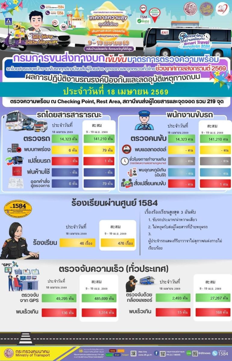 นายสรพงศ์ ไพฑูรย์พงษ์ อธิบดีกรมการขนส่งทางบก เปิดเผยว่า กรมการขนส่งทางบก ได้ดำเนินการตามมาตรการอำนวยความสะดวกและปลอดภัย ช่วงเทศกาลสงกรานต์ 2569 โดยมีมาตรการตรวจความพร้อมรถโดยสารสาธารณะและพนักงานขับรถ ณ สถานีขนส่งผู้โดยสารและจุดจอด, Check Point, Rest Area รวม 219 จุด ทั่วประเทศ ระหว่างวันที่ 9 – 19 เม.ย. 2569 เพื่อป้องกันและลดอุบัติเหตุทางถนนตลอดช่วงเทศกาลสงกรานต์ โดยคาดว่าในปีนี้จะมีประชาชนเดินทางกลับภูมิลำเนาหรือเดินทางท่องเที่ยวตามสถานที่ต่าง ๆ จำนวนมาก และเน้นย้ำให้ผู้ประกอบการขนส่ง ผู้ให้บริการสถานีขนส่งผู้โดยสารและจุดจอดทุกแห่ง ตรวจความพร้อมของรถและความพร้อมของผู้ขับรถก่อนออกเดินทาง ตามแบบ Checklist เช่น การมีใบอนุญาตขับรถที่ถูกต้องตามประเภทใบอนุญาตขับรถและไม่หมดอายุตรวจความพร้อมด้านร่างกายและการตรวจวัดระดับแอลกอฮอล์ในลมหายใจต้องเป็นศูนย์มิลลิกรัมเปอร์เซ็นต์ ชั่วโมงการขับรถไม่เกินที่กฎหมายกำหนด รถโดยสารสาธารณะทุกคันต้องมีสภาพมั่นคงแข็งแรงทั้งสภาพตัวรถภายนอกและภายในรวมทั้งอุปกรณ์เพื่อความปลอดภัยต่าง ๆ ต้องพร้อมใช้งานอยู่เสมอพร้อมจัดเจ้าหน้าที่ให้คำแนะนำและให้ความรู้แก่ผู้โดยสารกรณีเกิดเหตุฉุกเฉินและขอให้ผู้โดยสารทุกที่นั่งคาดเข็มขัดนิรภัยตลอดการเดินทางเพื่อป้องกันการบาดเจ็บและเสียชีวิตเมื่อรถเกิดอุบัติเหตุ สำหรับผลการดำเนินการตรวจความพร้อม ในวันที่ 18 เมษายน 2569 ตรวจรถโดยสารสาธารณะและพนักงานขับรถแล้ว 14,323 คัน พบรถบกพร่อง 6 คัน ดำเนินการออกคำสั่งผู้ตรวจการแล้วทุกคัน ส่วนการตรวจความพร้อมพนักงานขับรถจำนวน 14,323 ราย ไม่พบพนักงานขับรถบกพร่อง